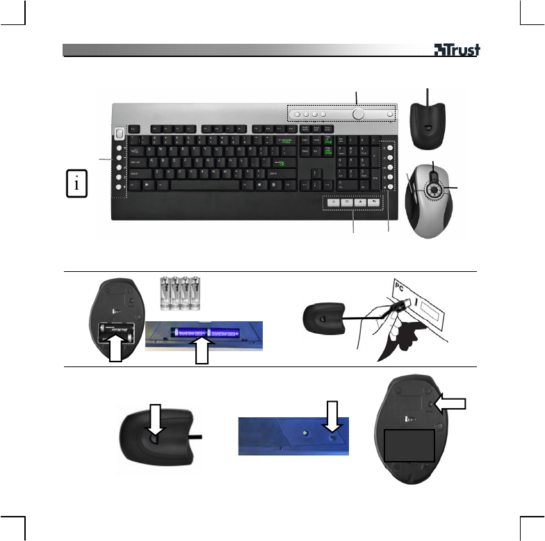 1 Open battery compartments on bottom sides of mouse and keyboard and place the 4 batteries.