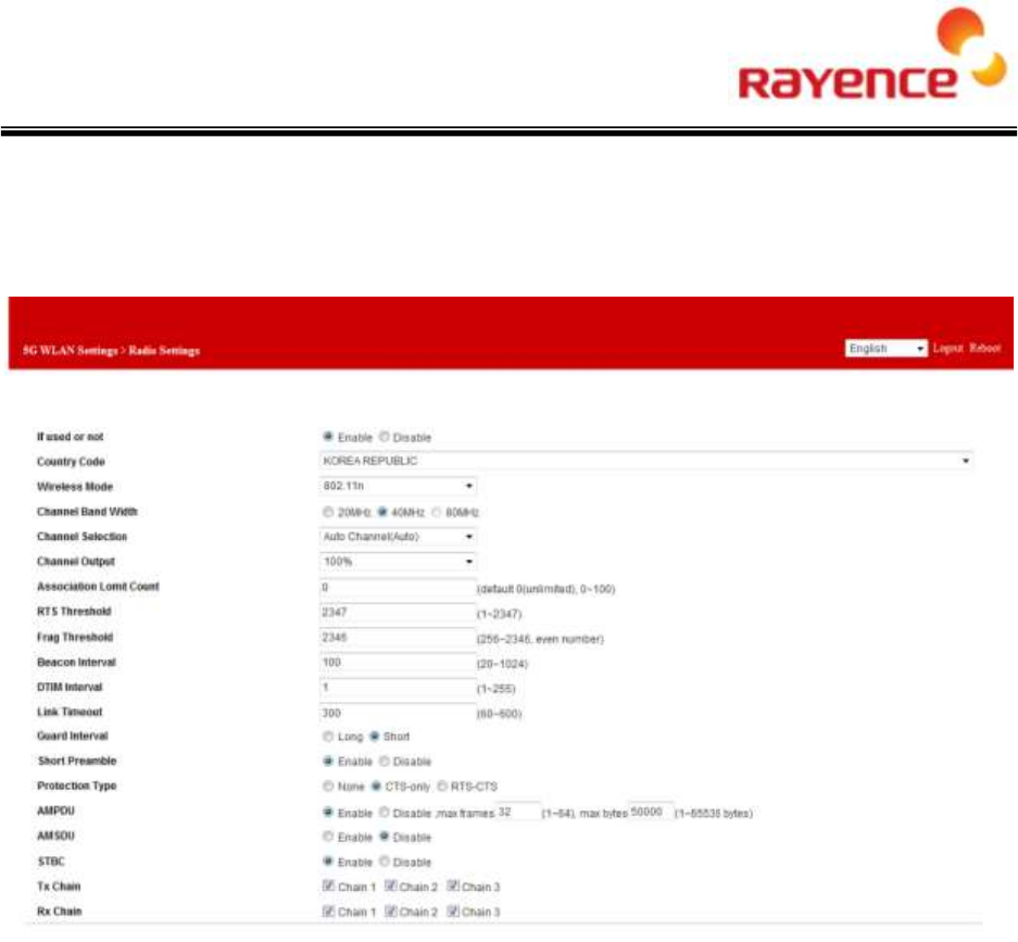 • Channel Band Width: The wireless bandwidth can be set to BBW 20M, 40M, or 80M.