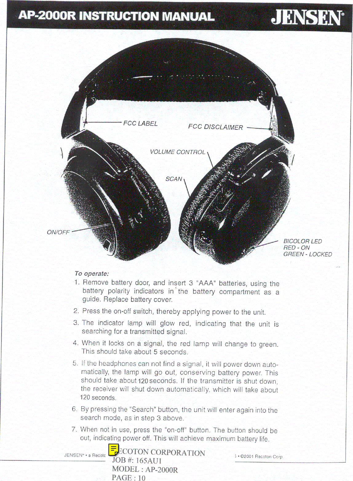 Recoton AP2000R Wireless Headphone Receiver User Manual users manual