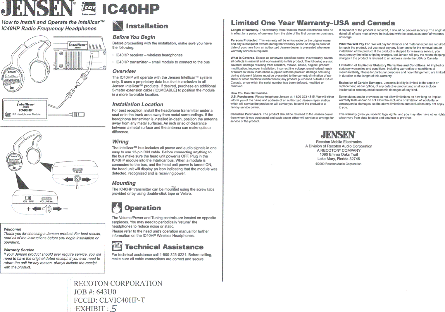Recoton IC40HP-T 900 MHz RF Headphone TX User Manual users manual