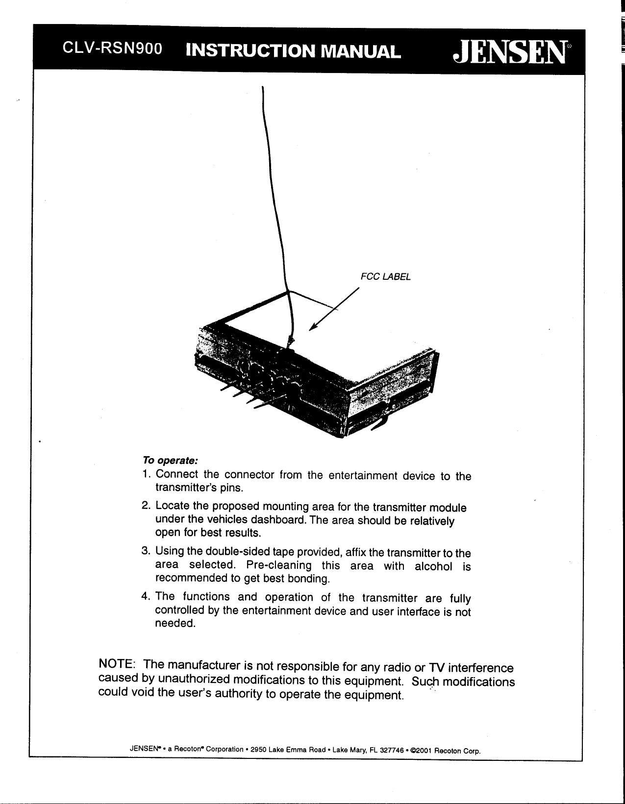 Recoton RSN900 900MHz Transmitter User Manual users manual