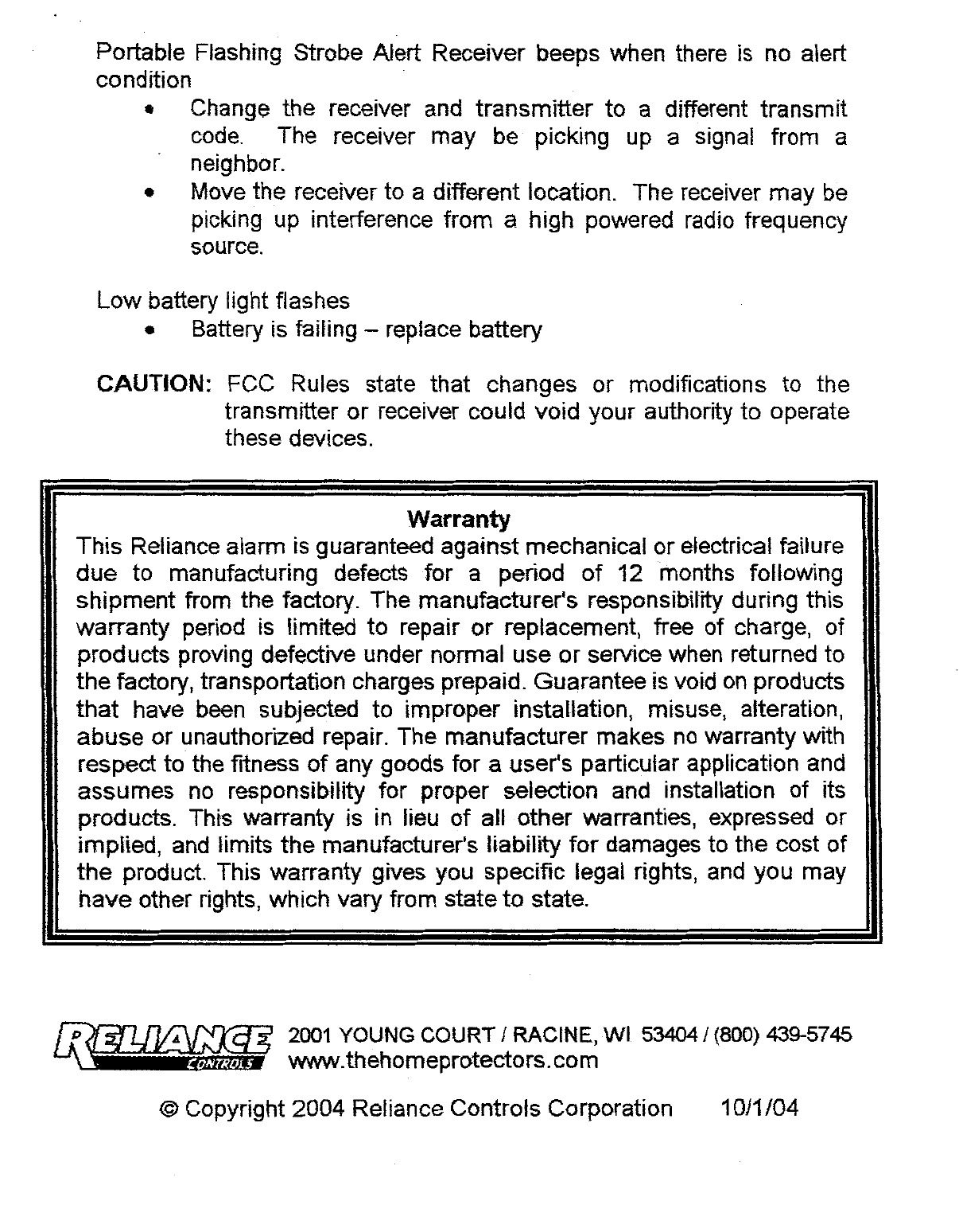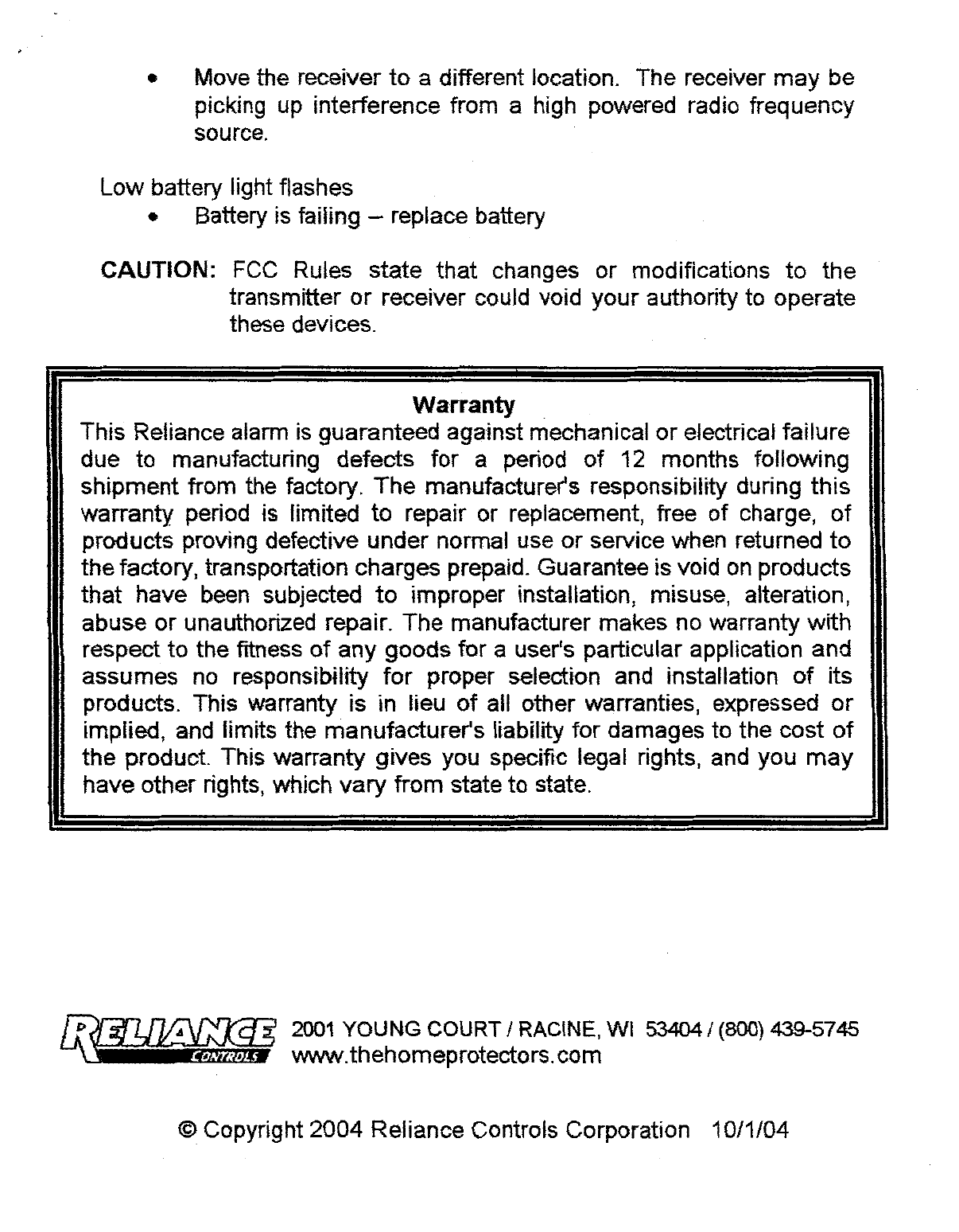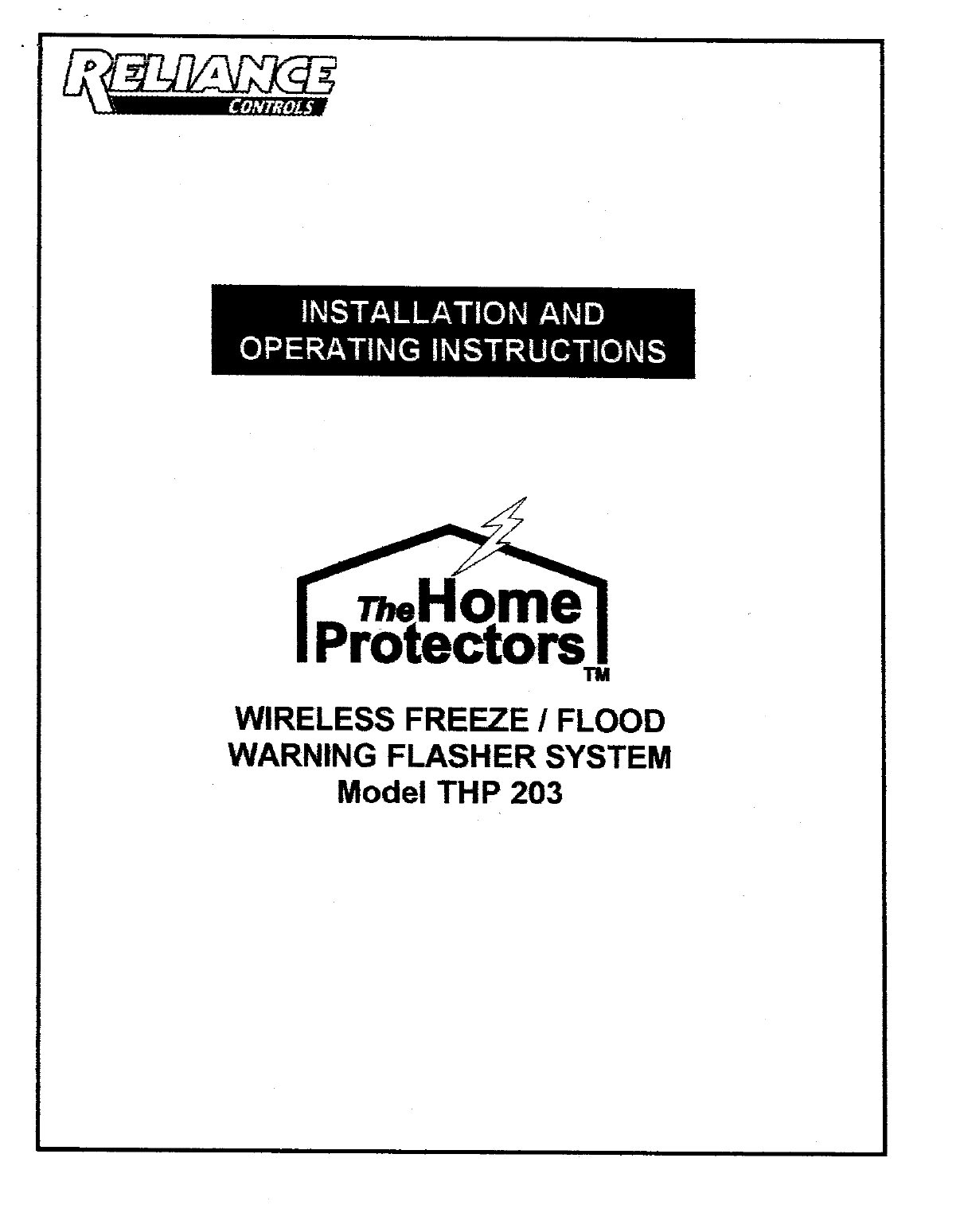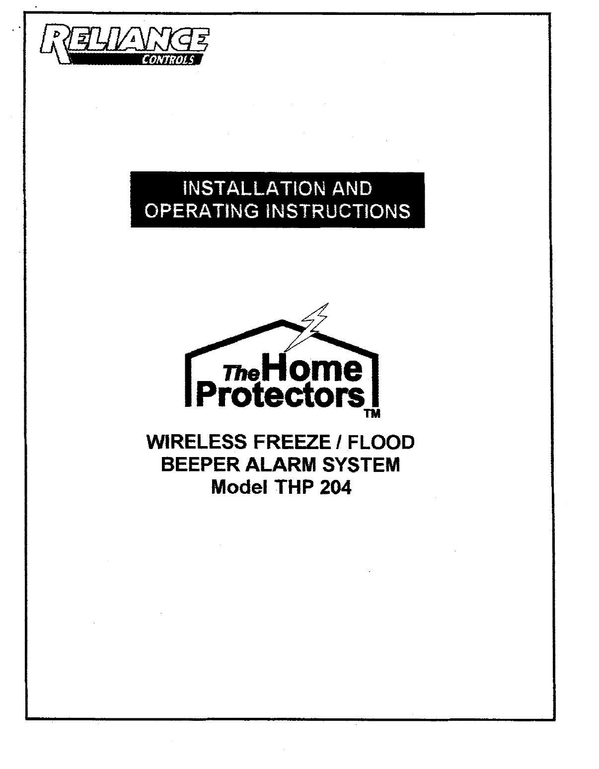 Reliance Controls 11031 Wireless Remote Flood or Freeze Warning Alarm User Manual