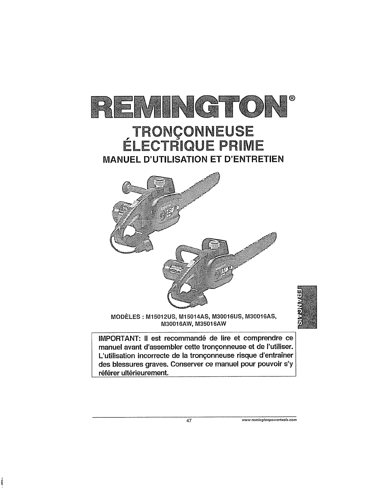 User Manual: Remington M15012US M15012US REMINGTON ELECTRIC CHAIN SAW - Manuals and Guides View the owners manual for your REMINGTON ELECTRIC CHAIN SAW #M15012US. Home:Lawn & Garden Parts:Remington Parts:Remington ELECTRIC CHAIN SAW Manual