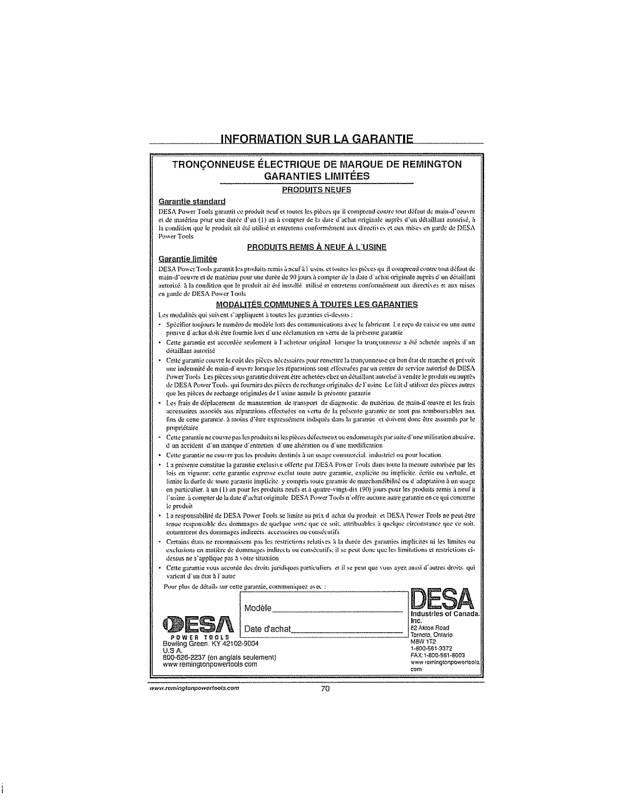 Pour plus de d_tails, visitez le www.remingtonpowertools.com.