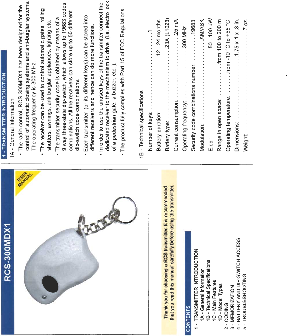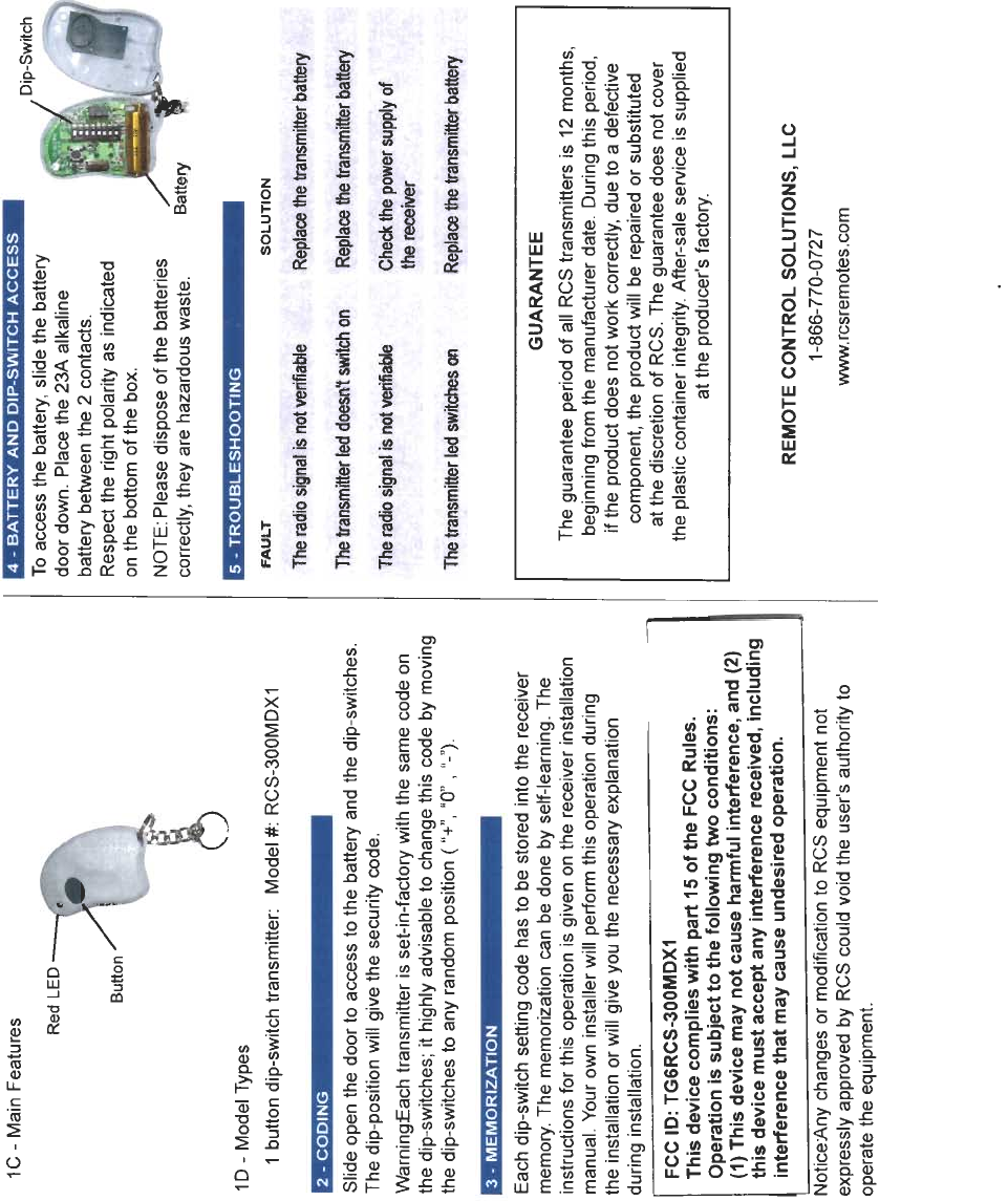 Remote Control Solutions RCS-300MDX1 300 MHz 10 dip-switch radio transmitter User Manual users manual