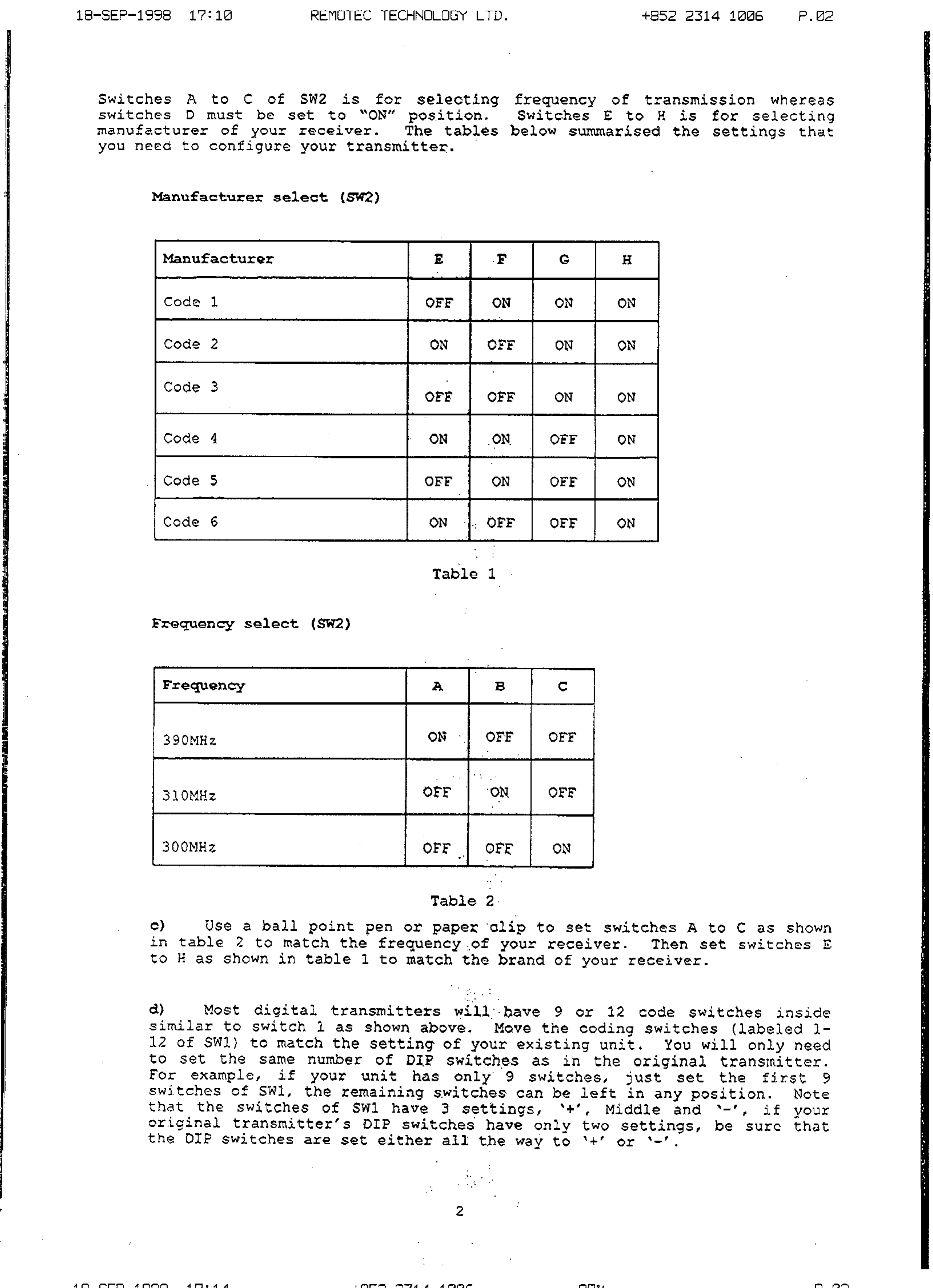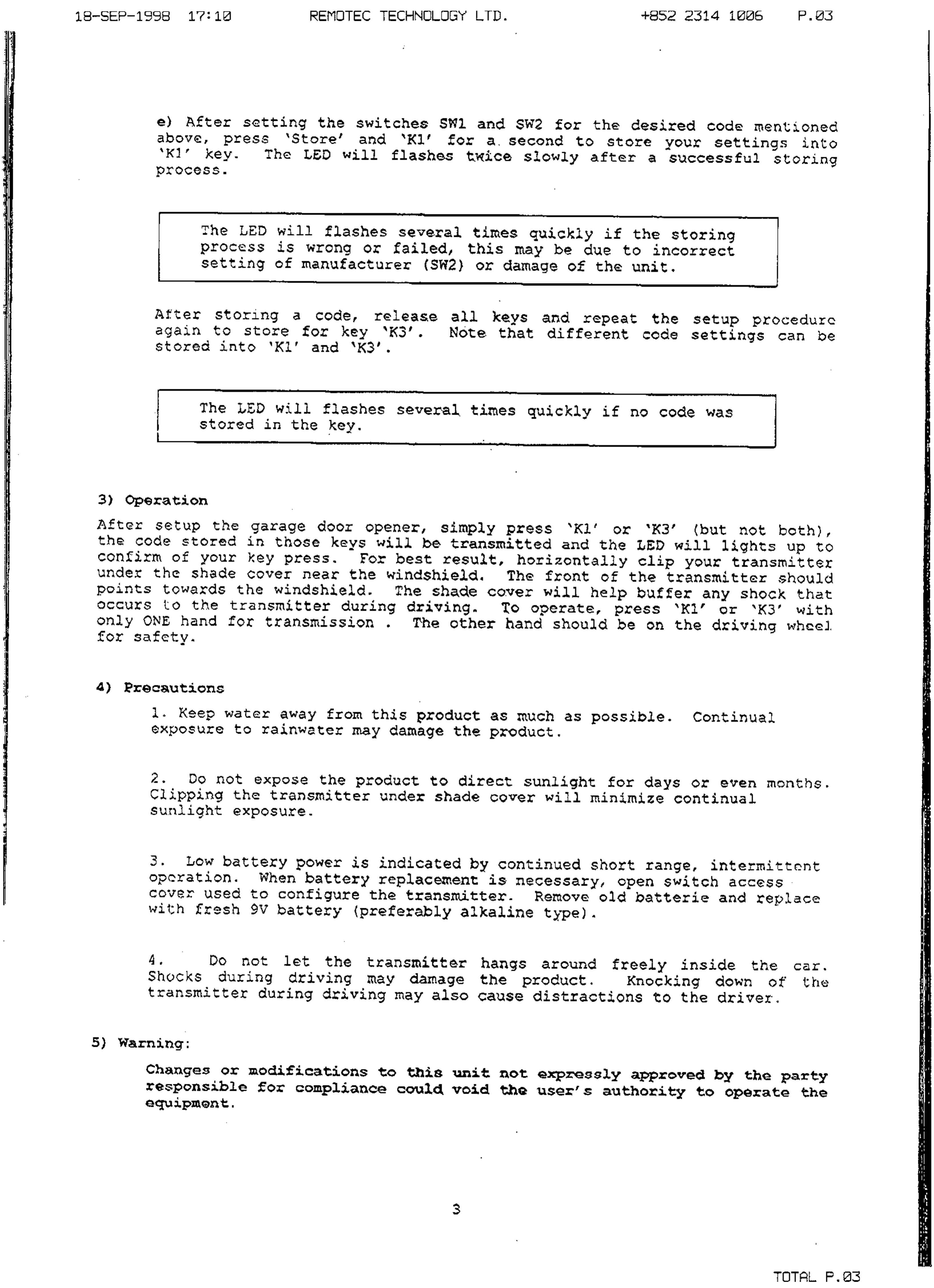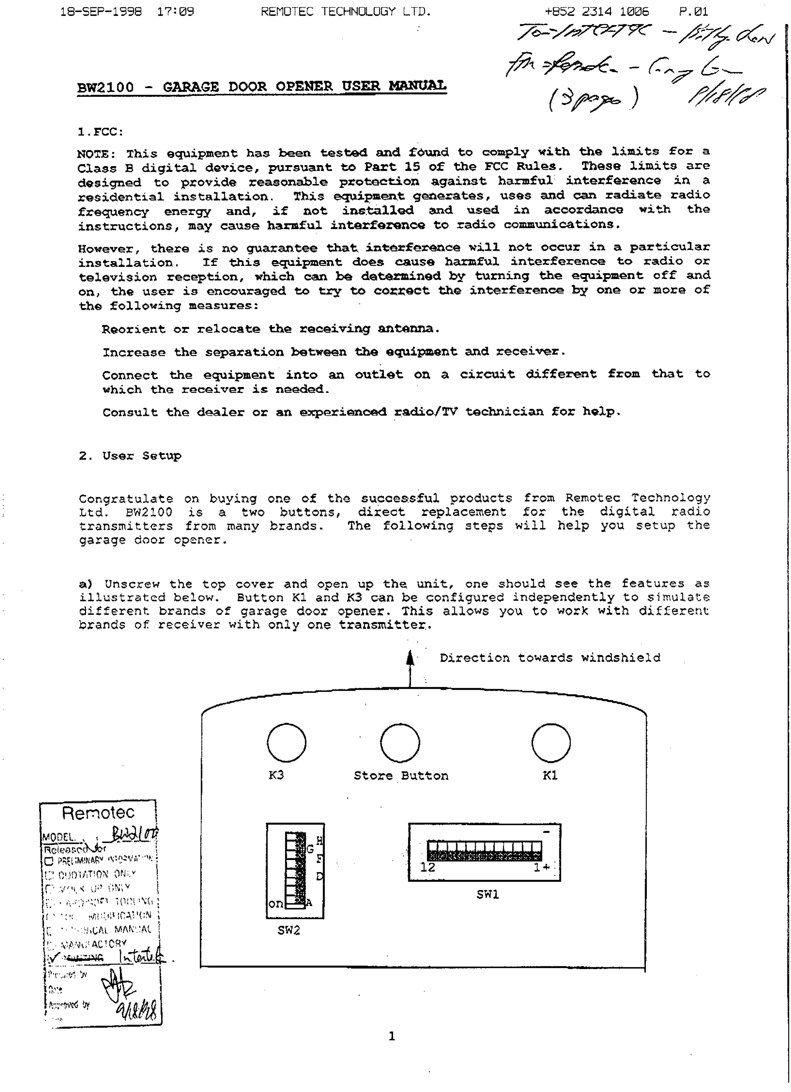 Remotec Technology BW2100TX-00 Garage Door Opener User Manual