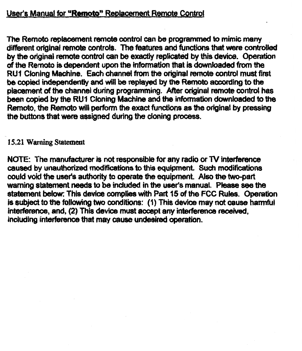 Remotes Unlimited Inc. SECURITY REMOTE CONTROL USERS MANUAL