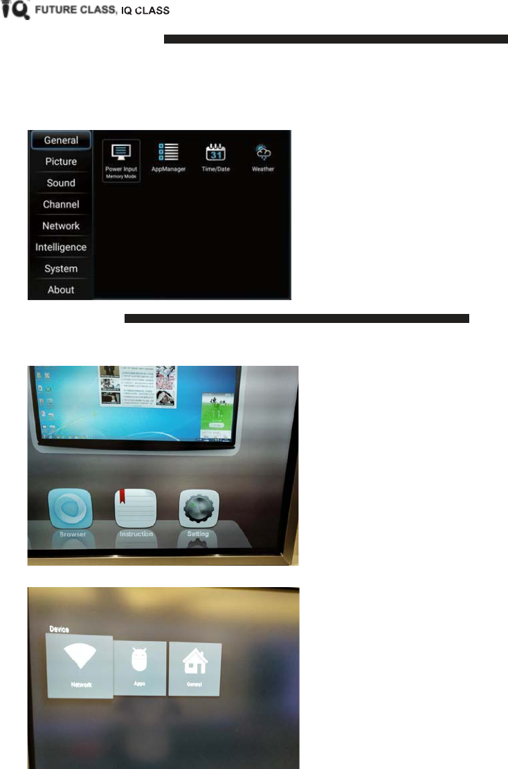 The System Settings include General/Image/Sound/Channel/Network/Intelligent/System/About