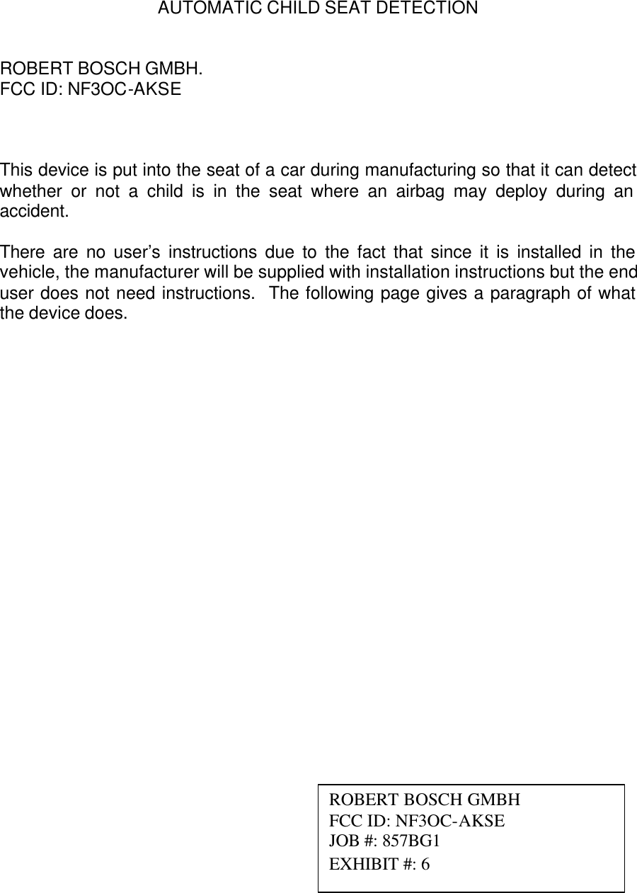 Robert Bosch OC-AKSE Automatic Child Seat Detection User Manual users manual