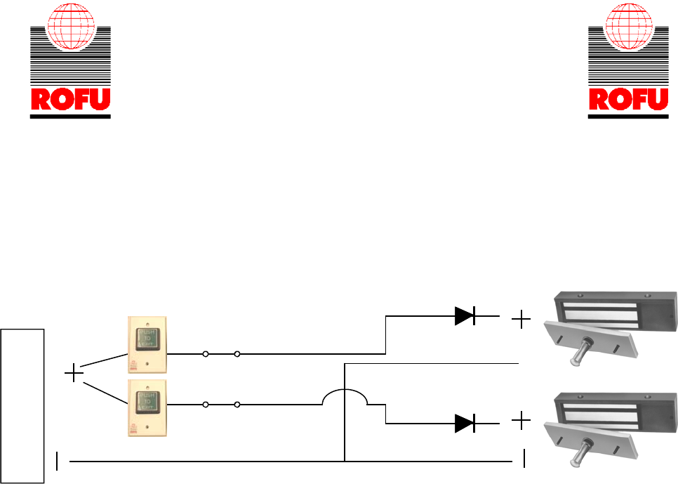 Depressing a push button, would open the circuit, stopping the flow of electricity to only one of the magnets or strikes to release.