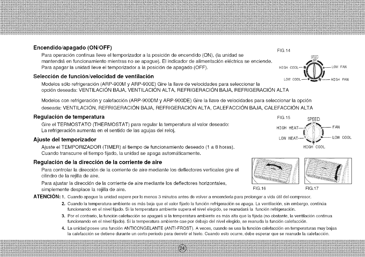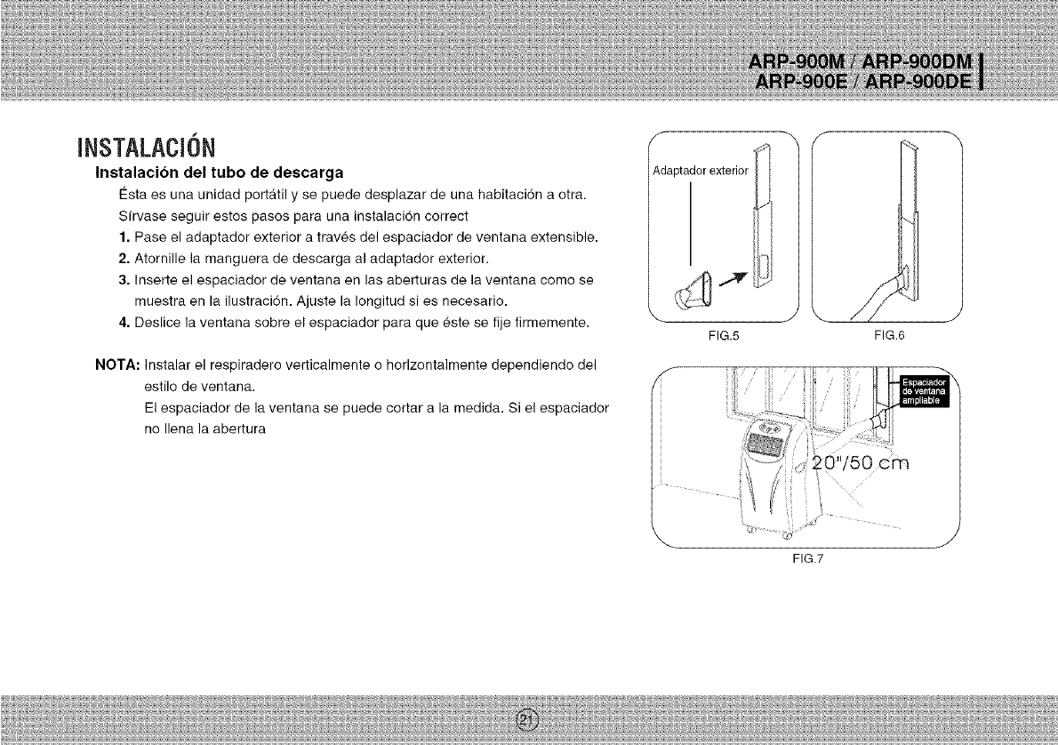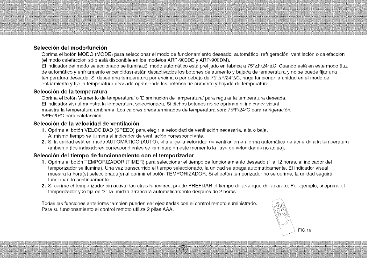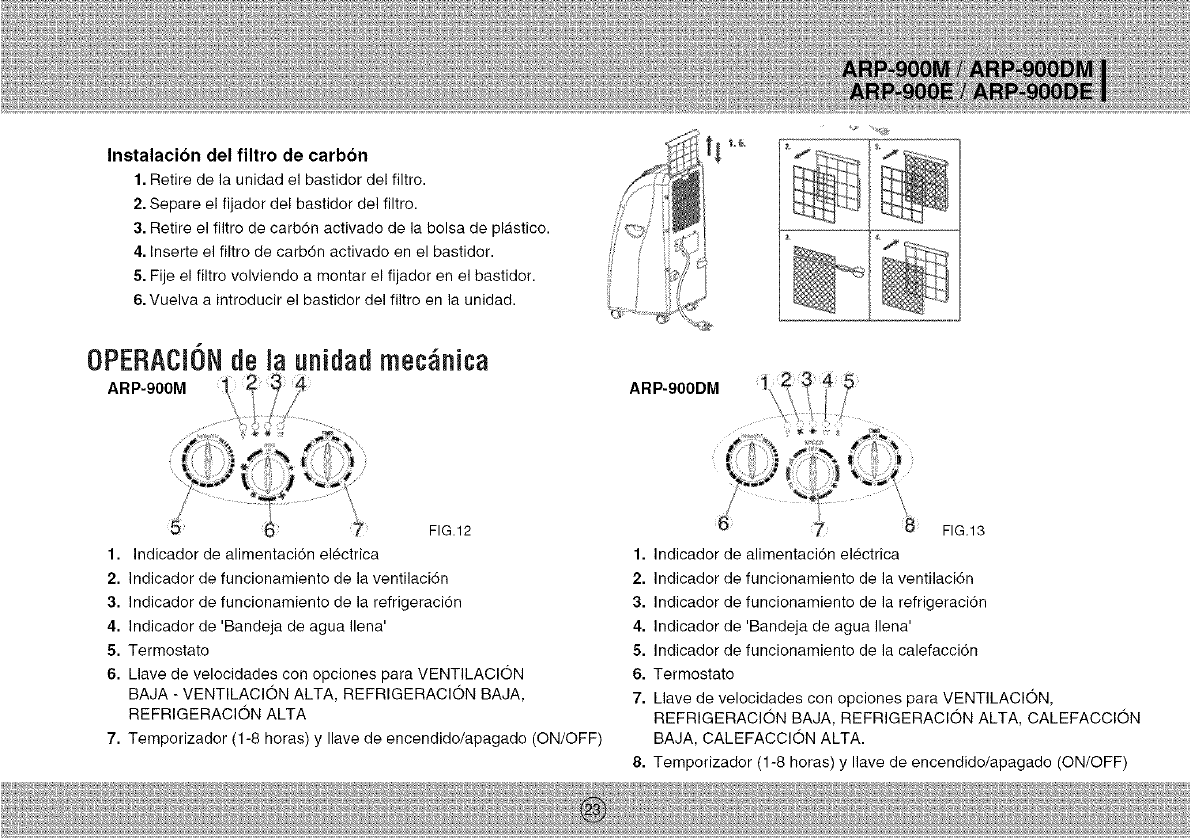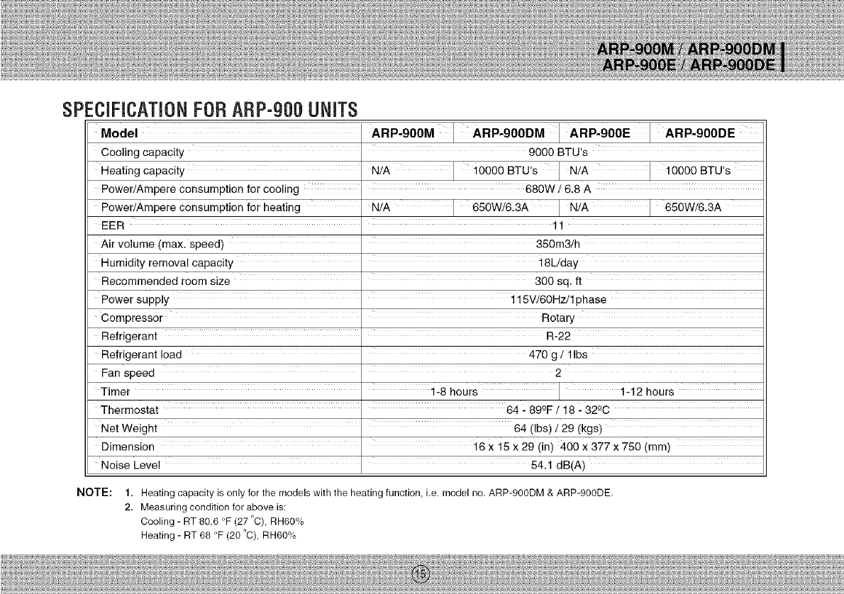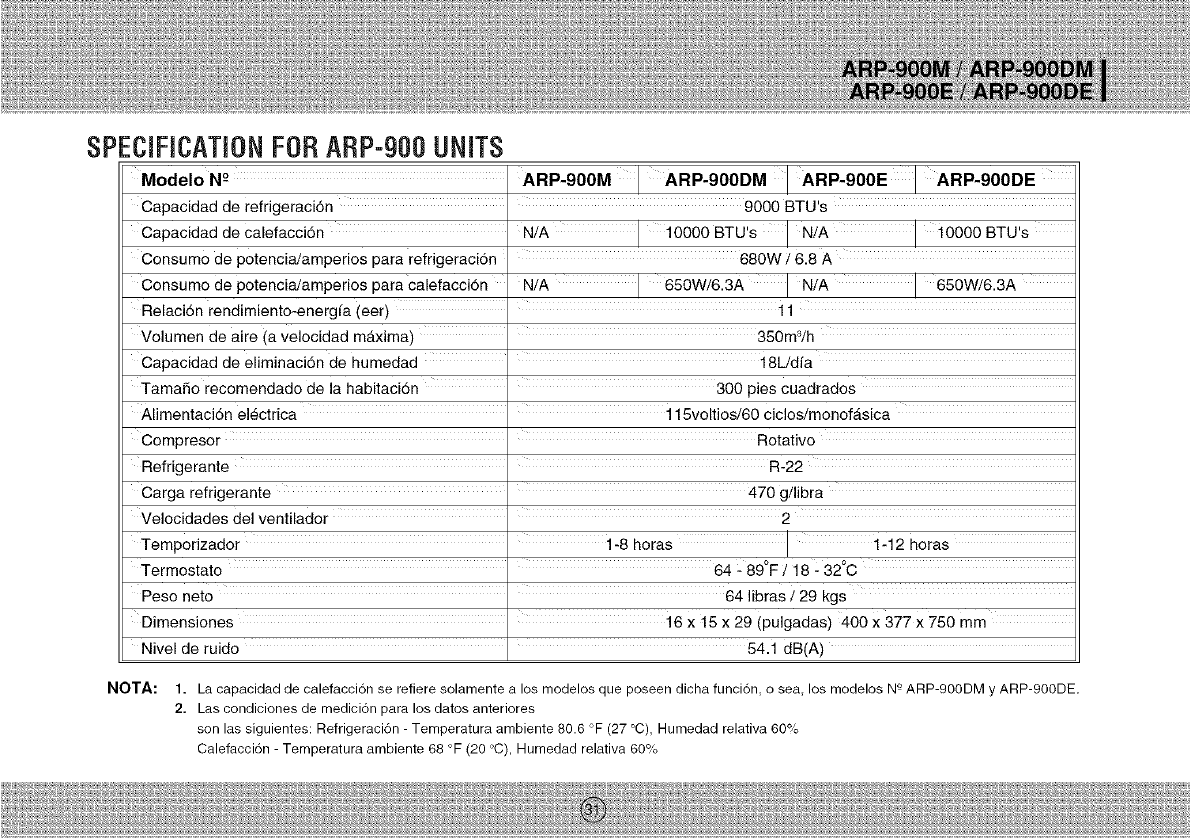 NOTA: 1. La capacidad de calefacci6n se refiere solamente a los modelos que poseen dicha funci6n o sea los modelos N° ARP-900DM y ARP-900DE.