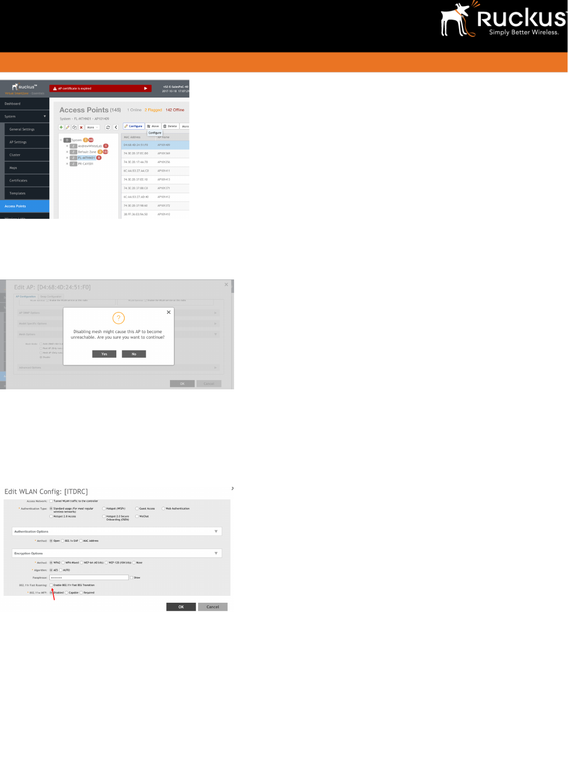 Otherwise, to mitigate CVE-2017-13082 PTK Reinstallation Vulnerability, follow the instructions to disable 802.11r (on SSID/WLAN) and Mesh