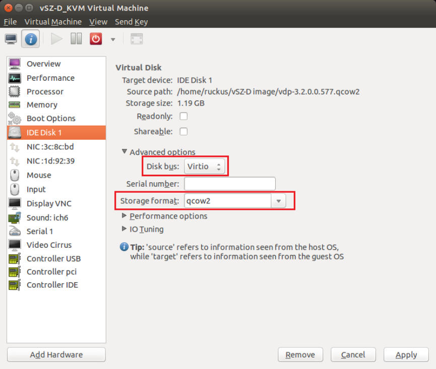 Ruckus Wireless recommends using Virtio as the disk bus and qcow2 as the storage format.