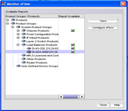 The Monitor sFlow dialog box displays products with their sFlow report availability. Users can select the product or group and launch the