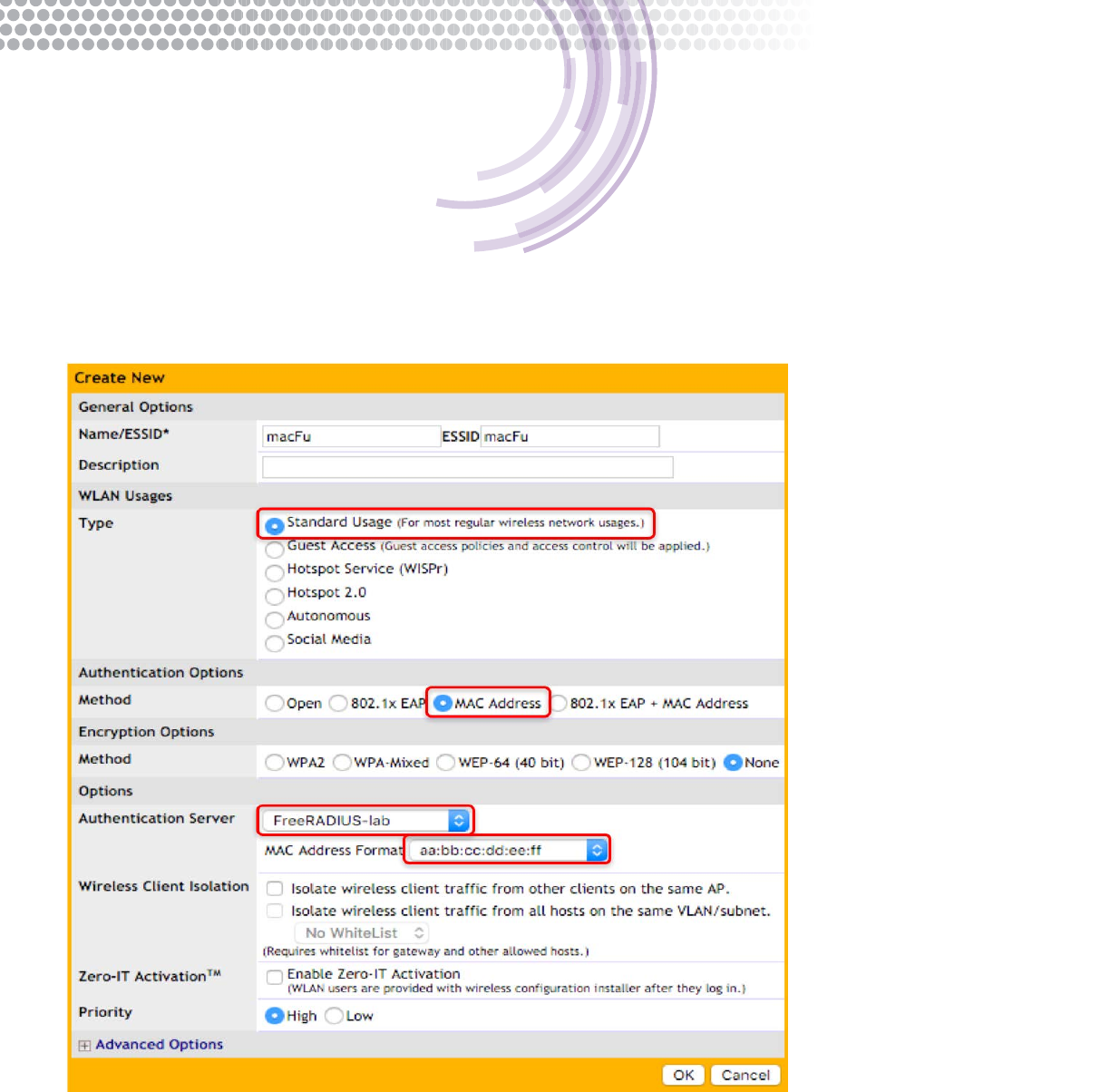 Once the WLAN is congured and broadcast by an AP. Connect a device whose MAC address is already in the RADIUS server
