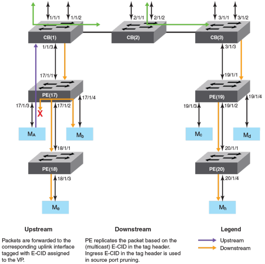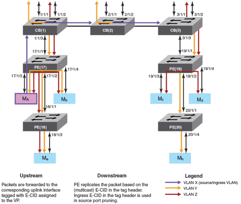 For multi-destination traffic, the CB sends a single copy of the packet for each VLAN to be replicated to the PE unit, while the PE unit