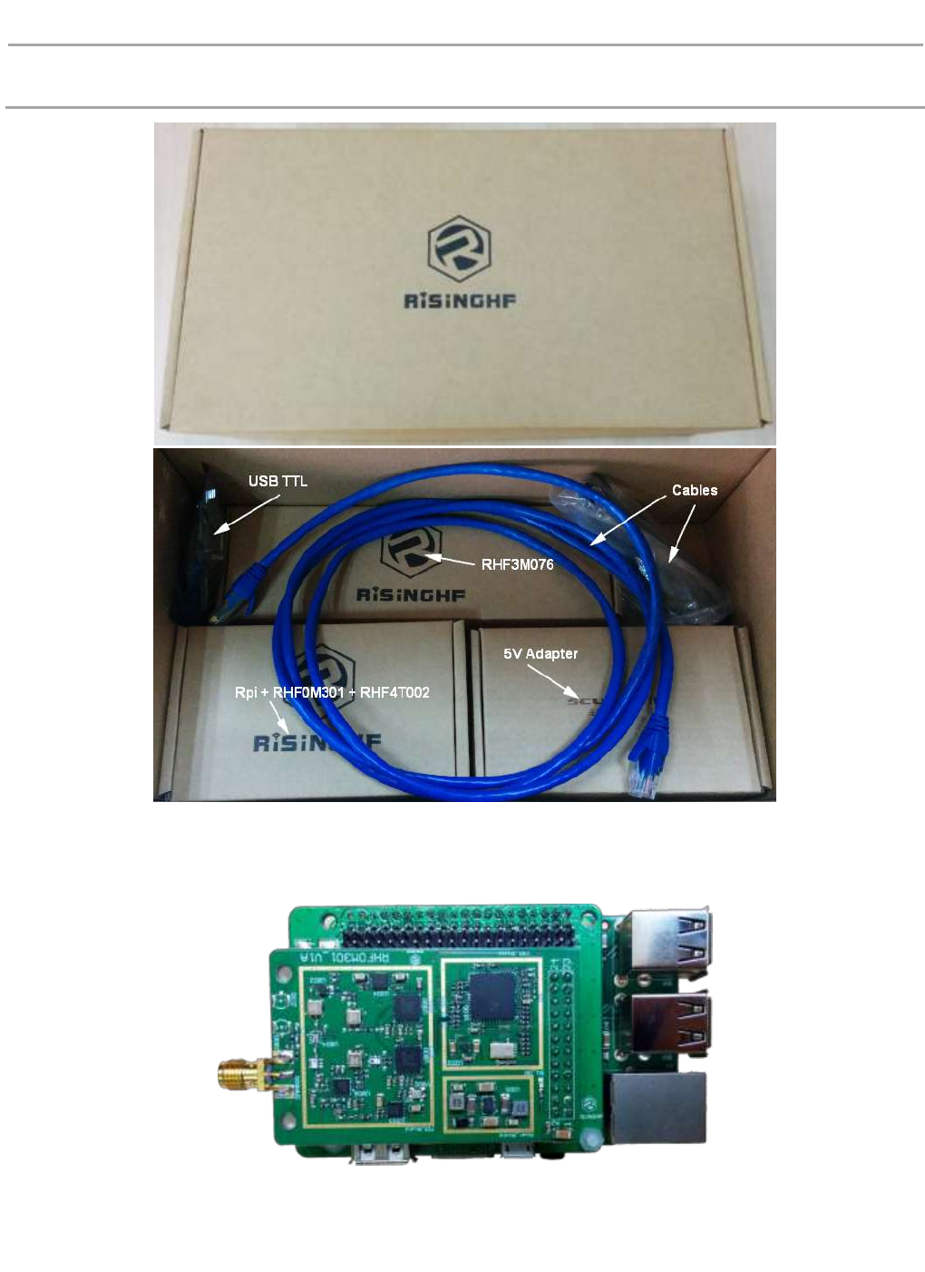 Open each box, and take out "RPi + RHF0M301 + RHF4T002", SD card is already burned RisingHF