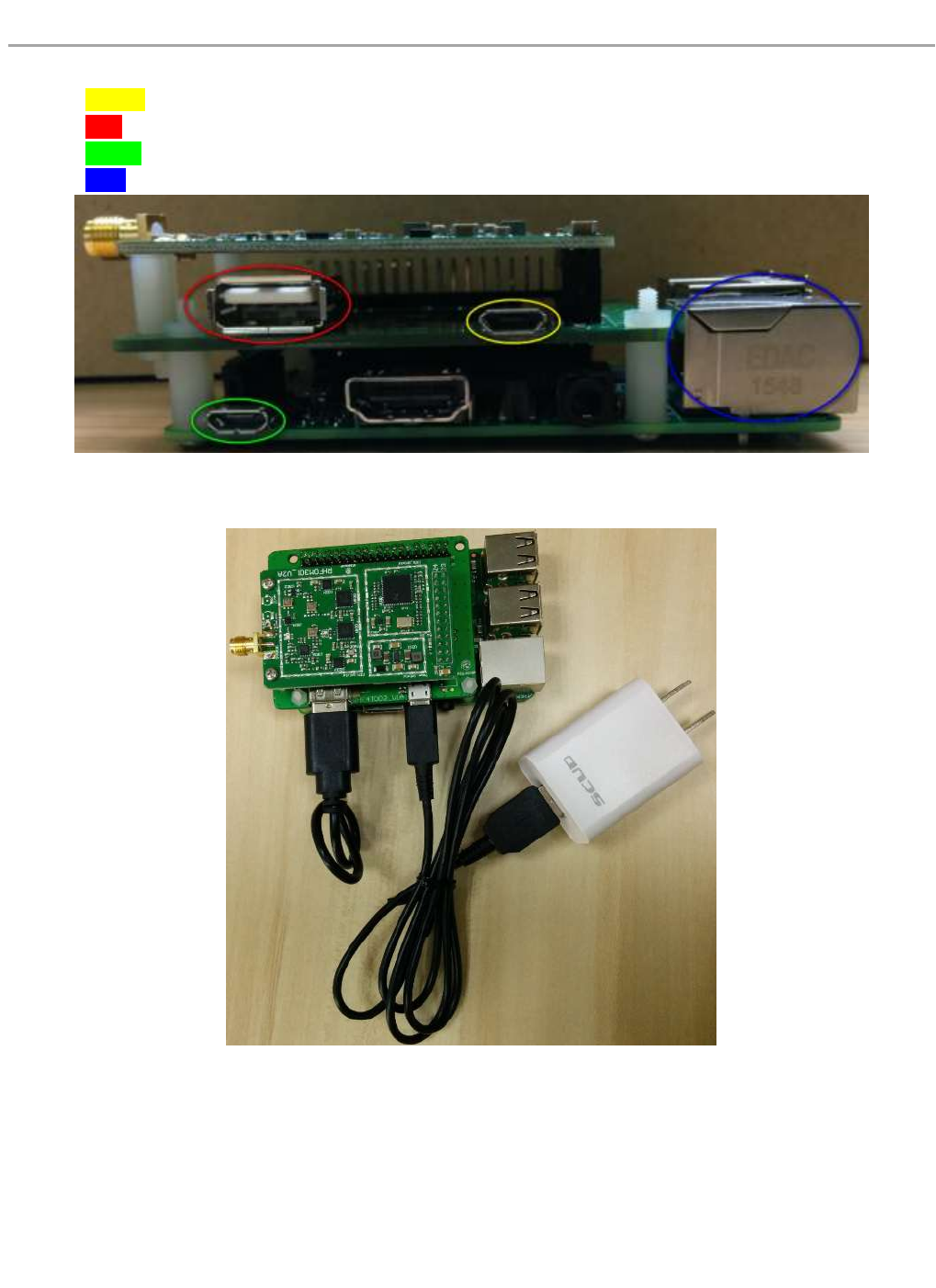 Please follow below picture to connect short USB cable (15cm), long USB cable (1M) and 5V/2A