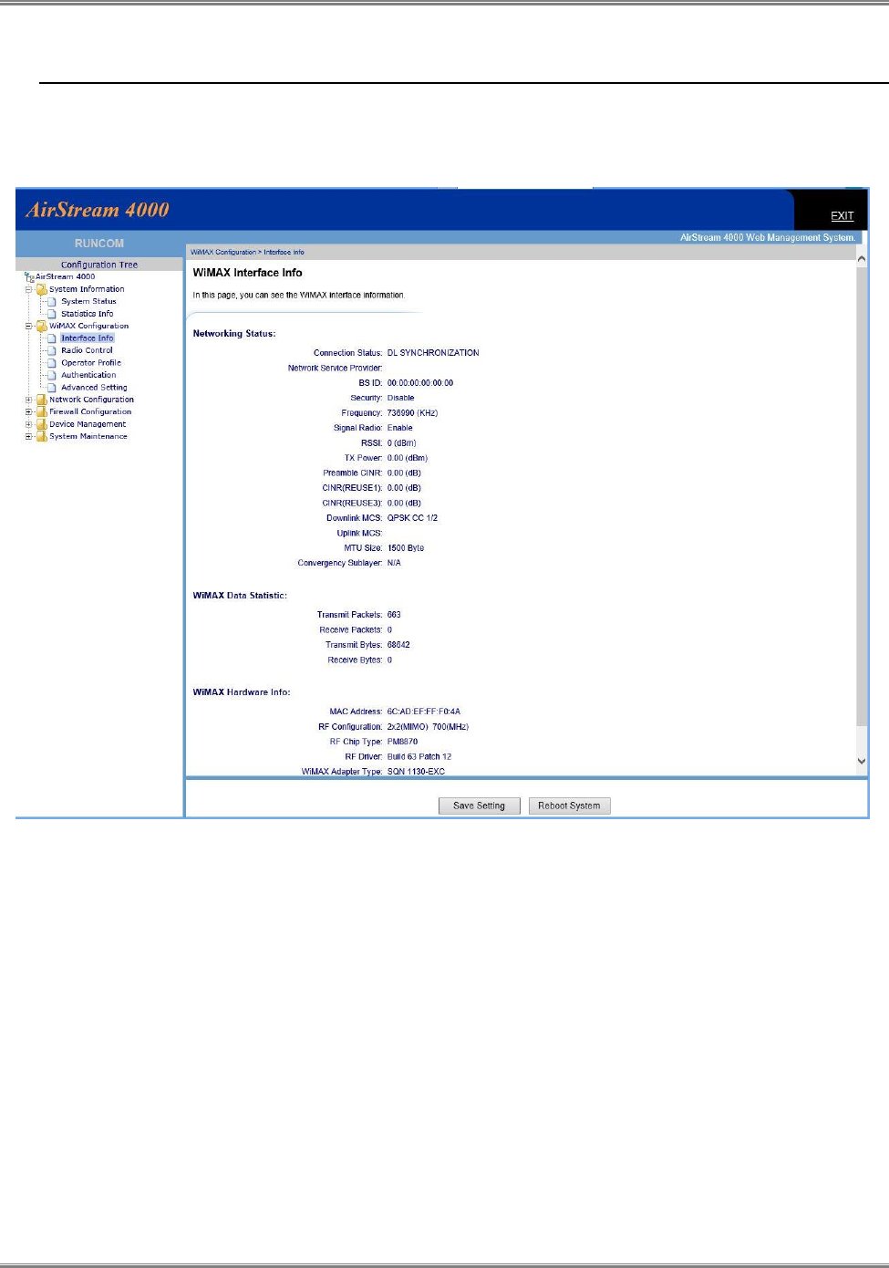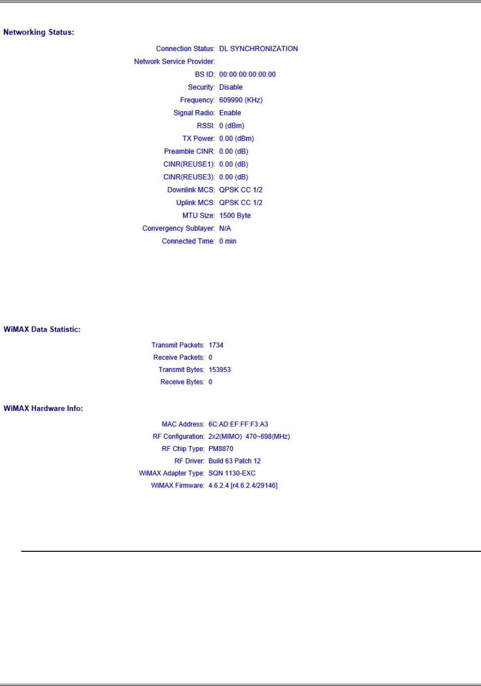 When clicking on the “Interface Info” link, the following WiMAX interface information is displayed.