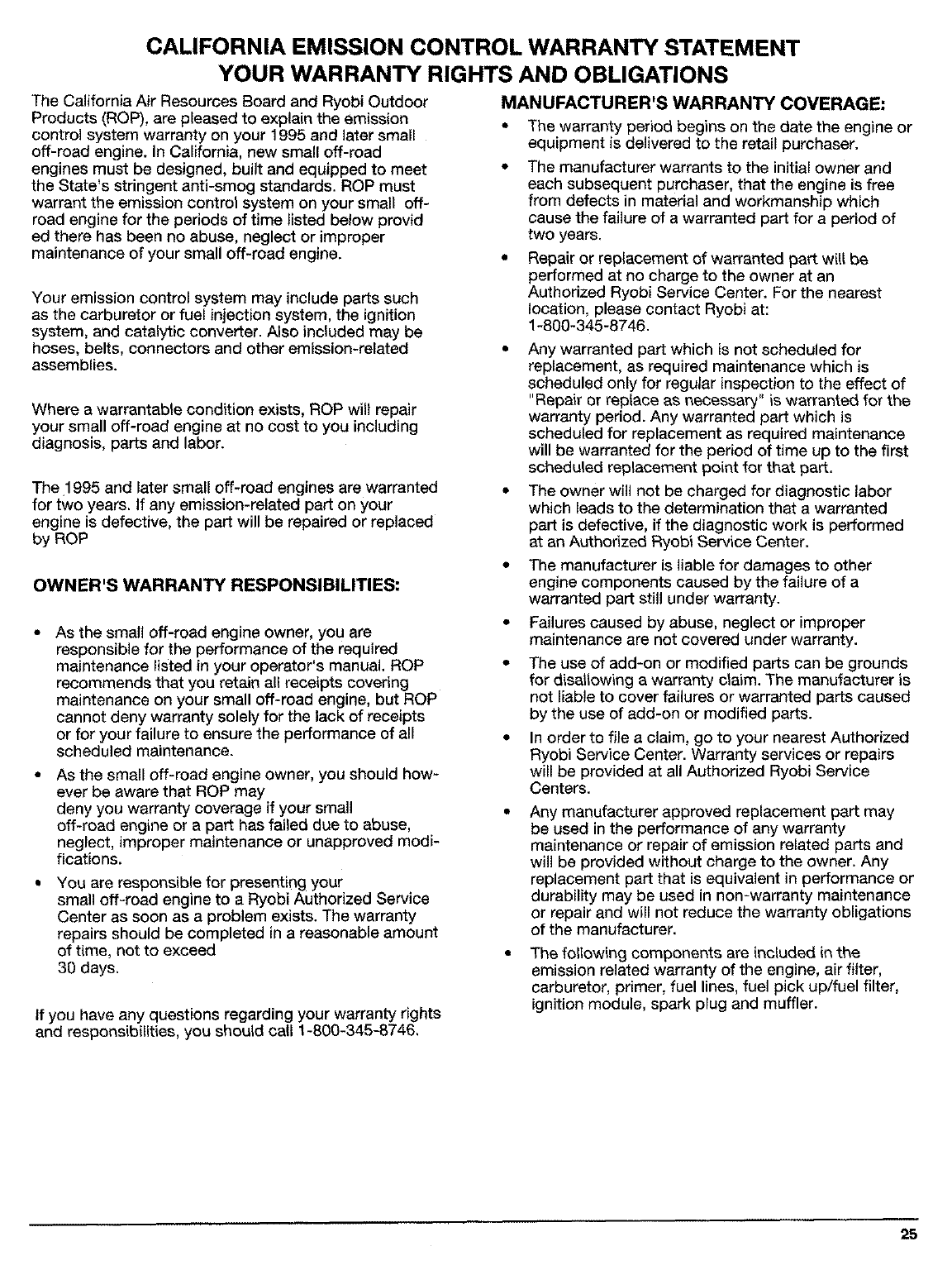 the RYOBI Operator's Manual. This warranty does not