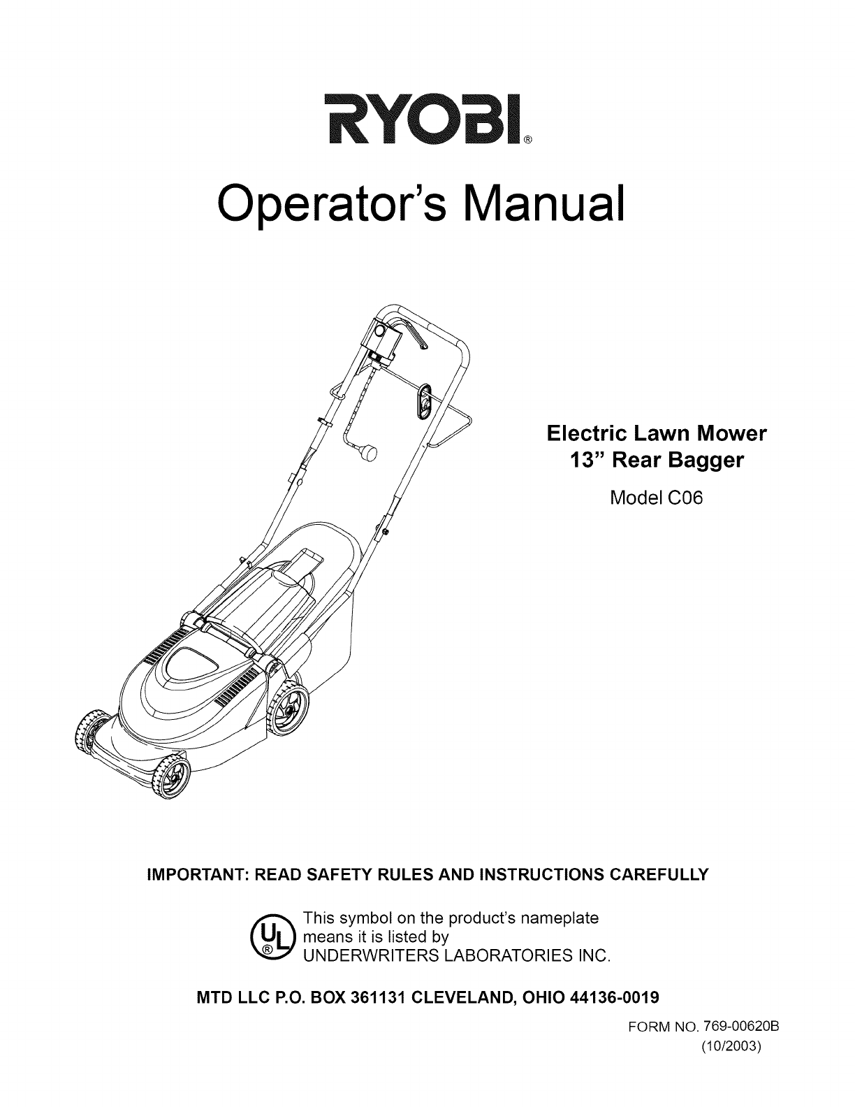 User Manual: Ryobi 18A-C06-734 18A-C06-734 RYOBI ELECTRIC MOWER - Manuals and Guides View the owners manual for your RYOBI ELECTRIC MOWER #18AC06734. Home:Lawn & Garden Parts:Ryobi Parts:Ryobi ELECTRIC MOWER Manual