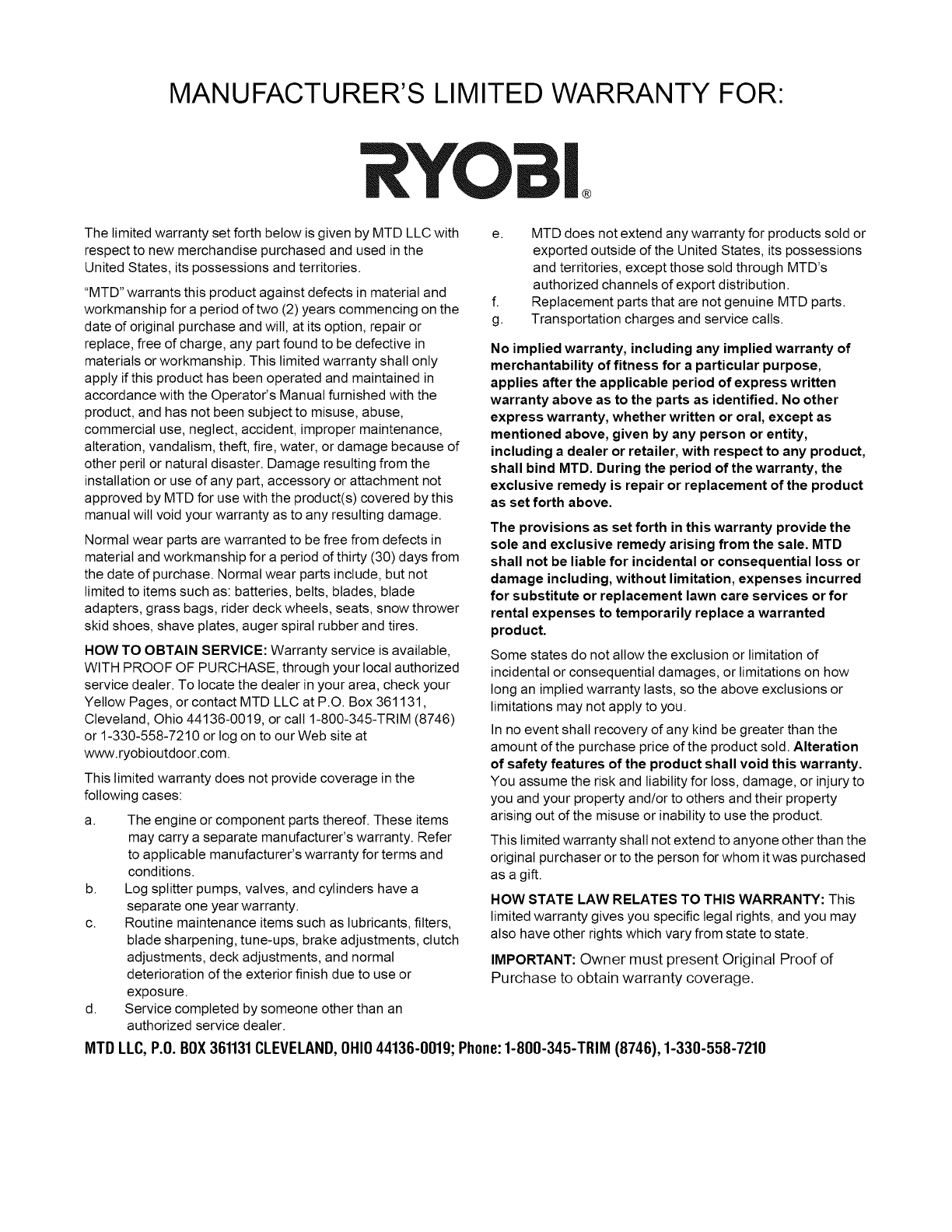MTD LLC, P.O.BOX361131CLEVELAND,OHIO44136-0019; Phone:1-800-345-TRIM (8746), 1-330-558-7210