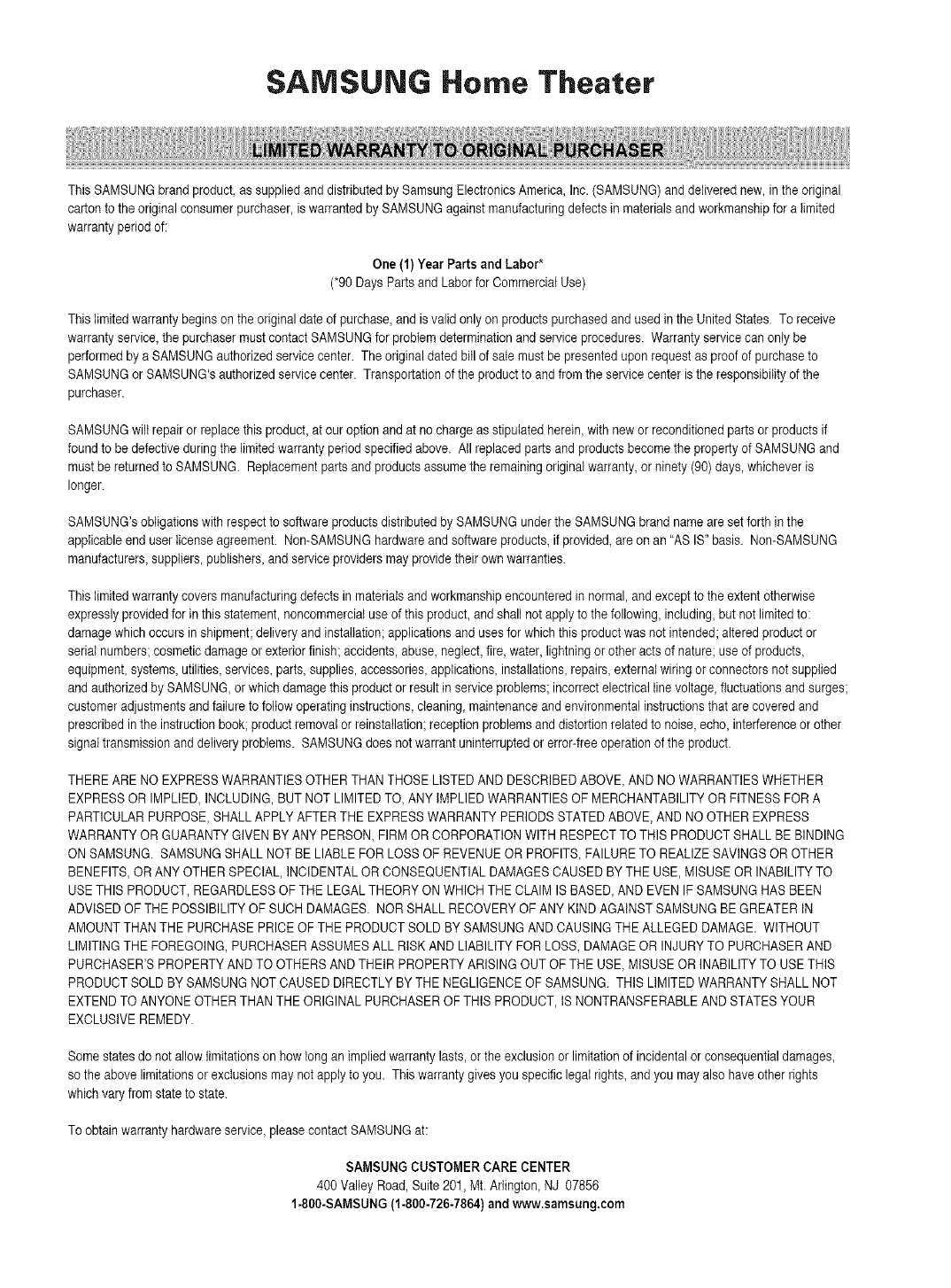 This SAMSUNGbrand product, as suppliedand distributed bySamsung ElectronicsAmerica, Inc. (SAMSUNG)and deliverednew, inthe original