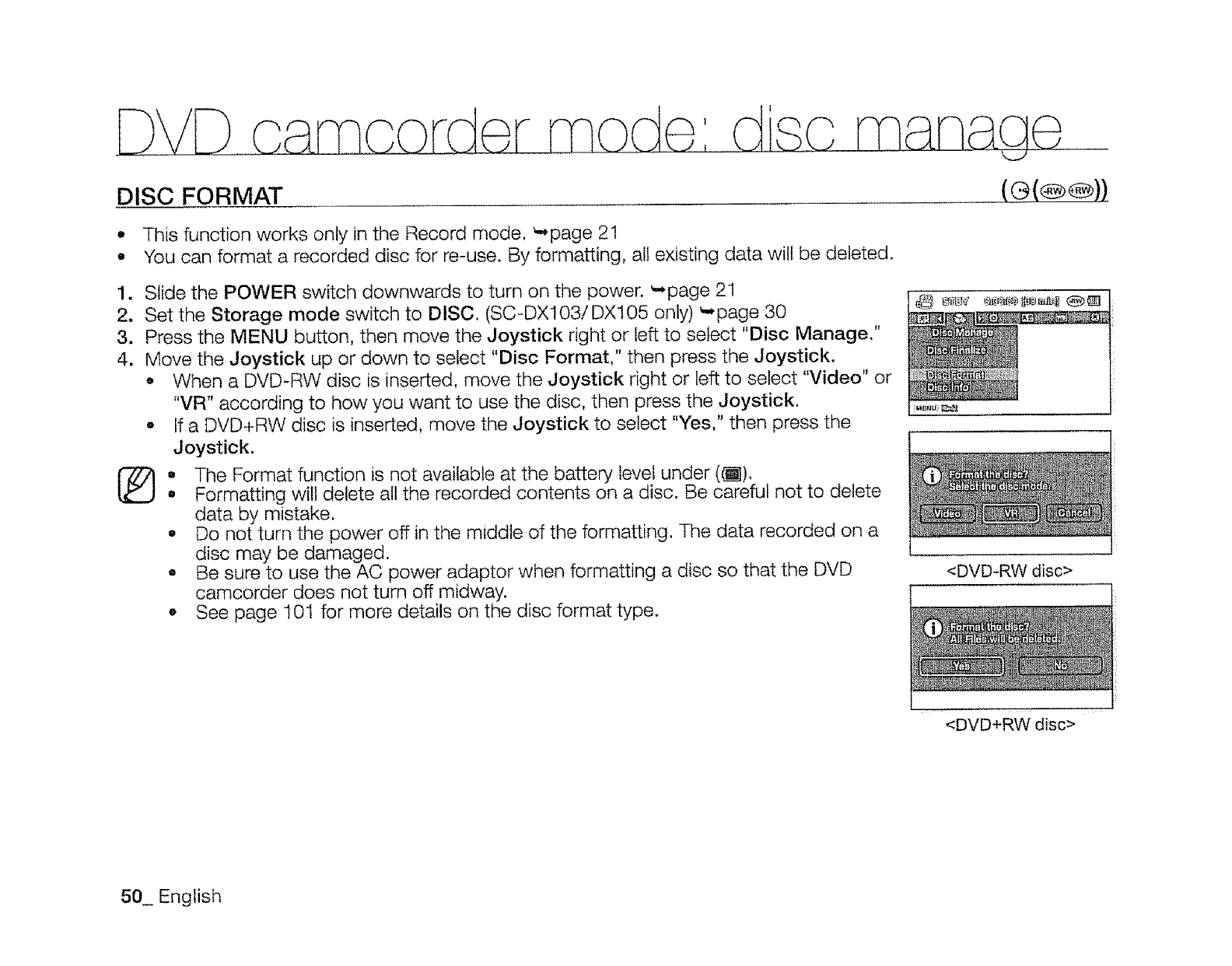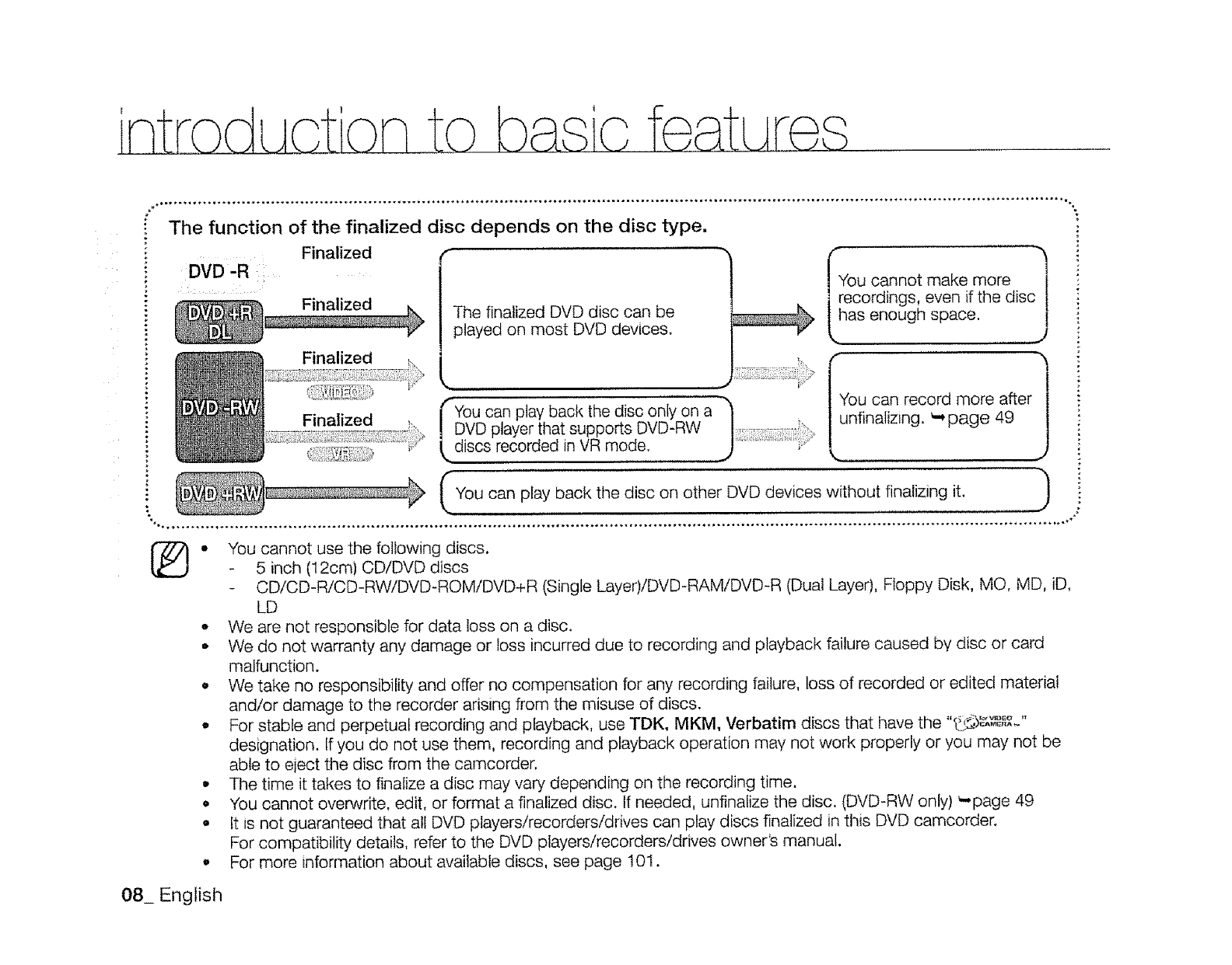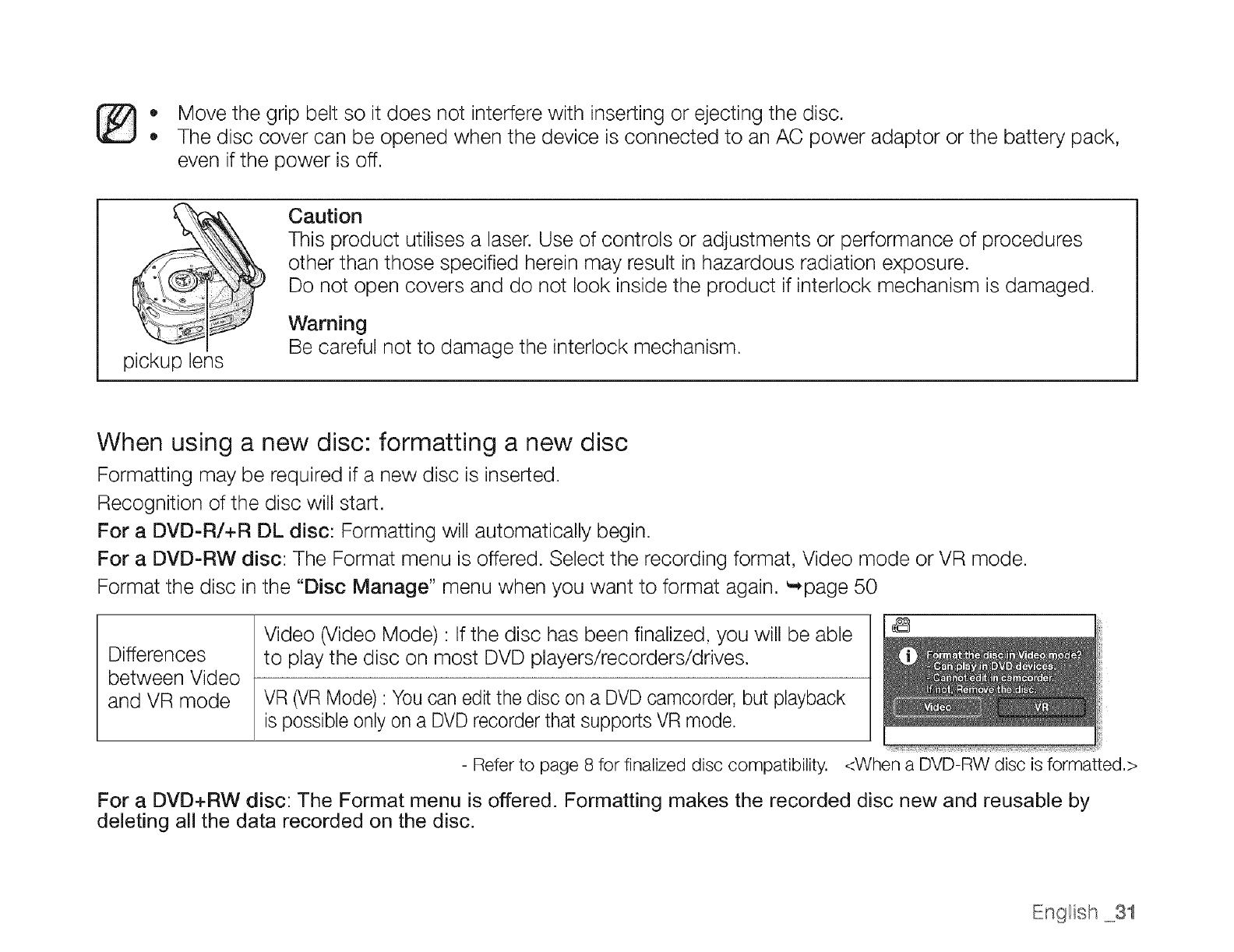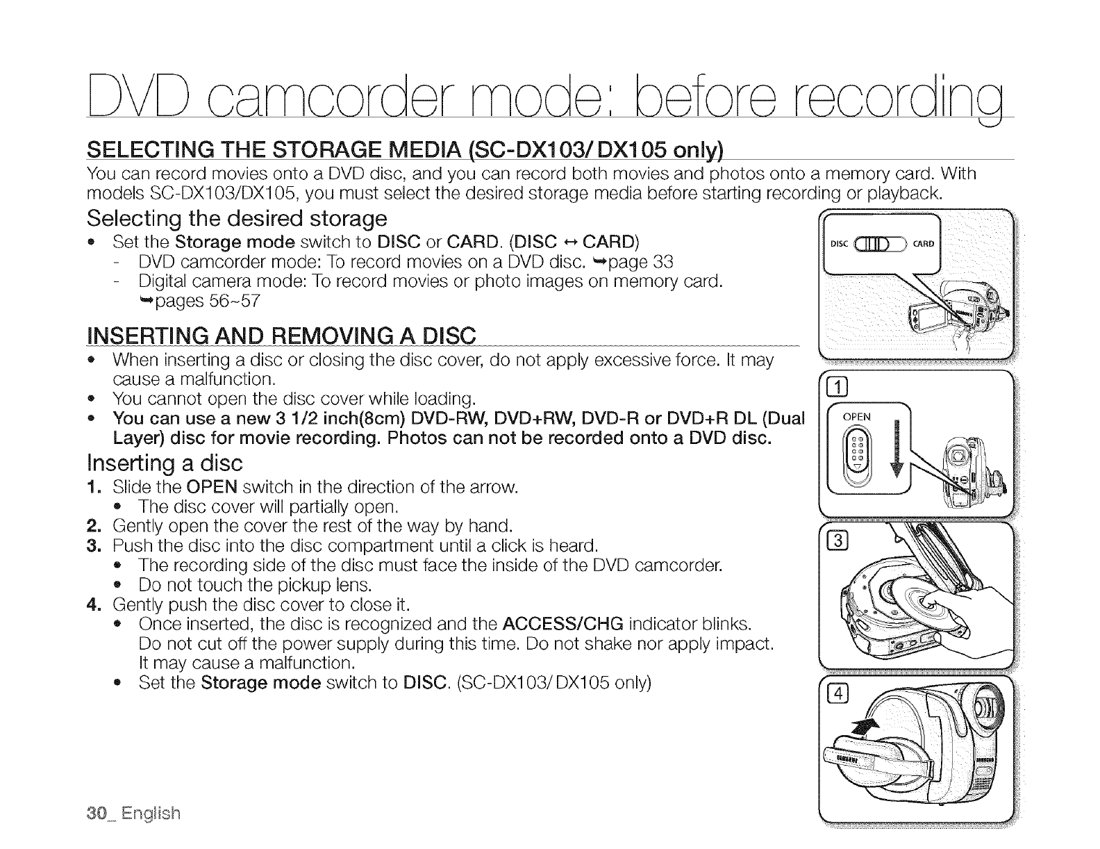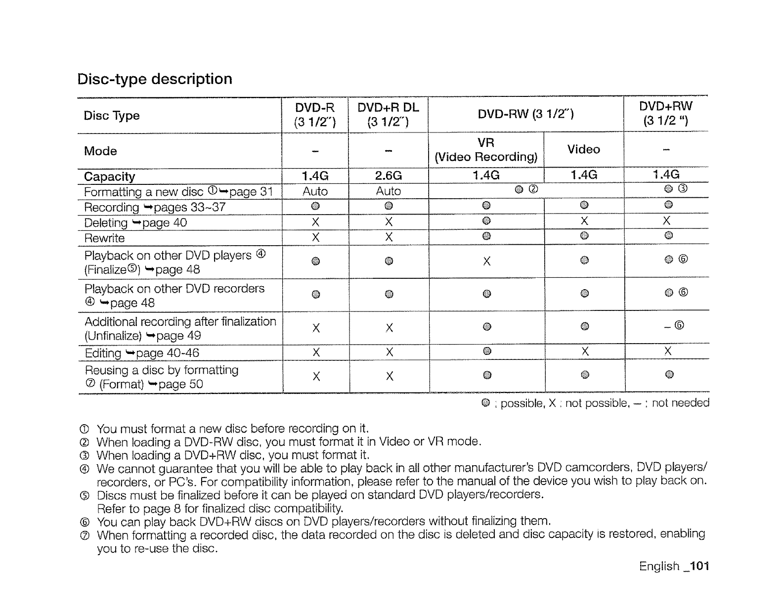 DVD-VIDEO recording with 3 I/2 inch (8cm) DVD-RW/+RWi-R/+R DL (Dual Layer) discs.