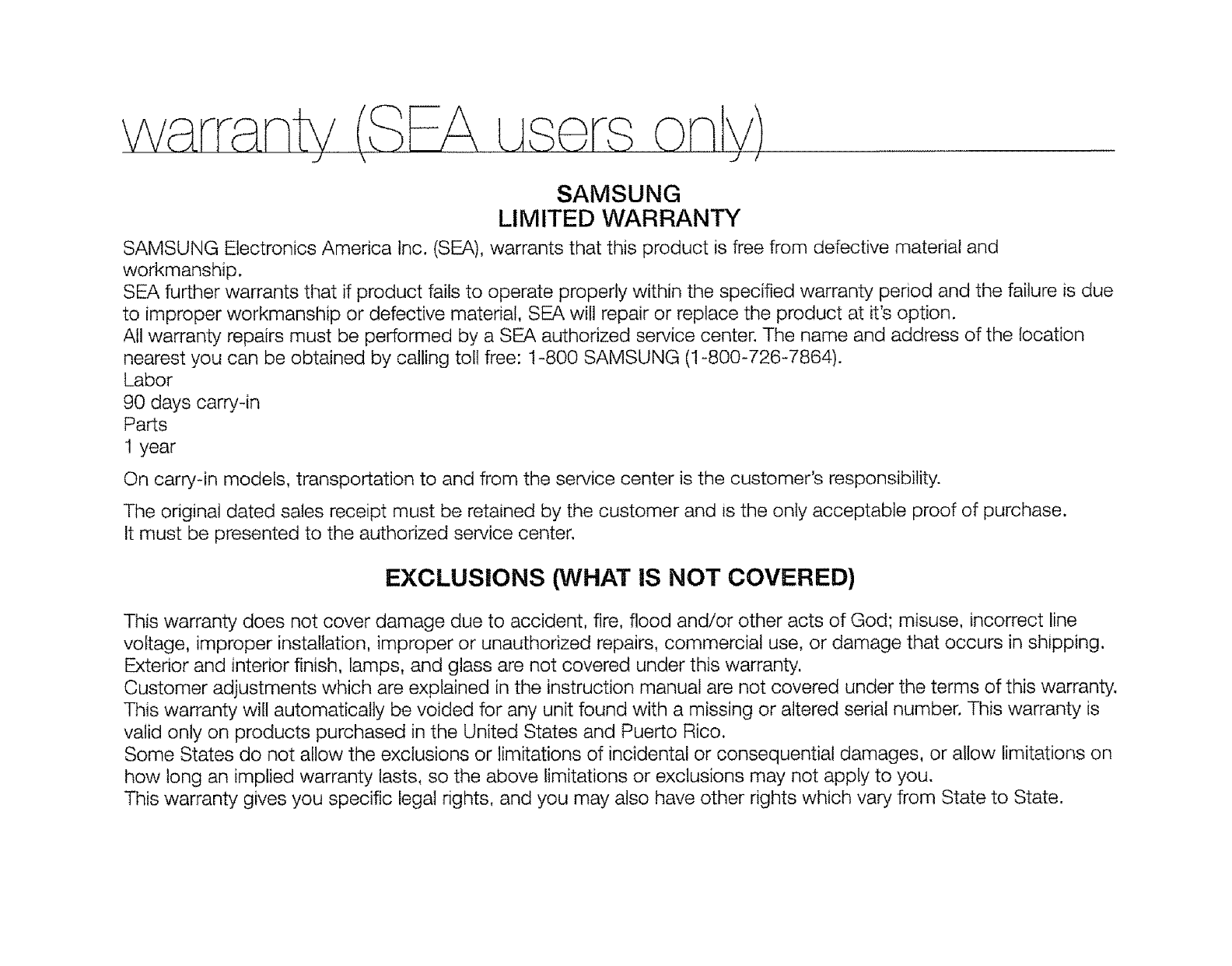SAMSUNG Electronics America lnc, (SEA), warrants that this product is free from defective material and