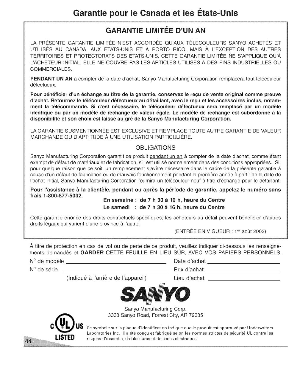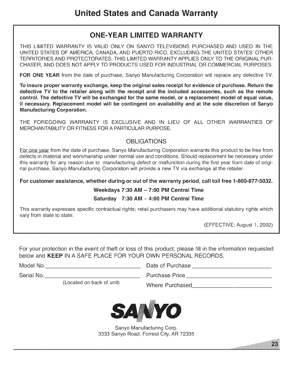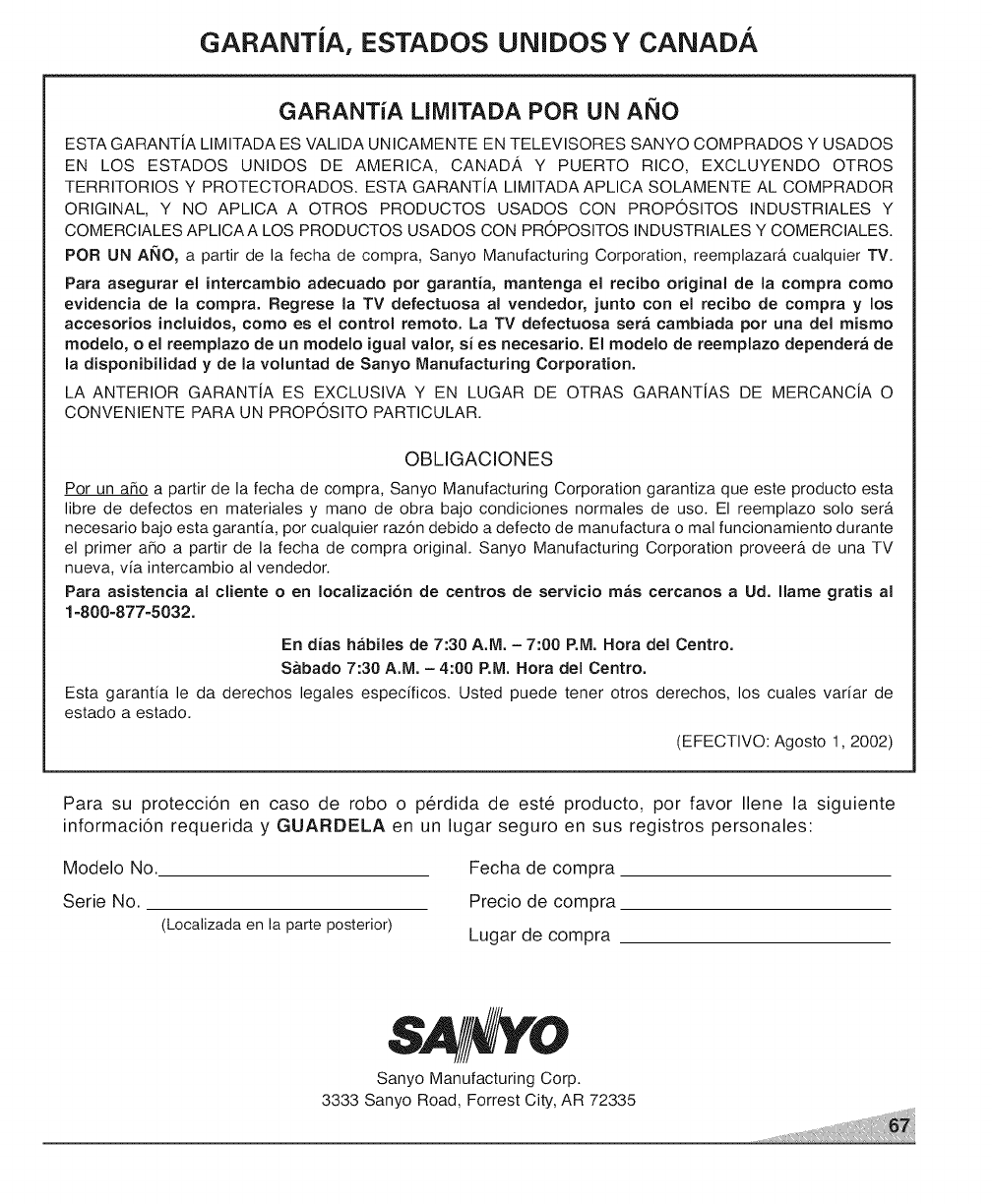 el primer a_o a partir de la fecha de compra original. Sanyo Manufacturing Corporation proveergt de una TV