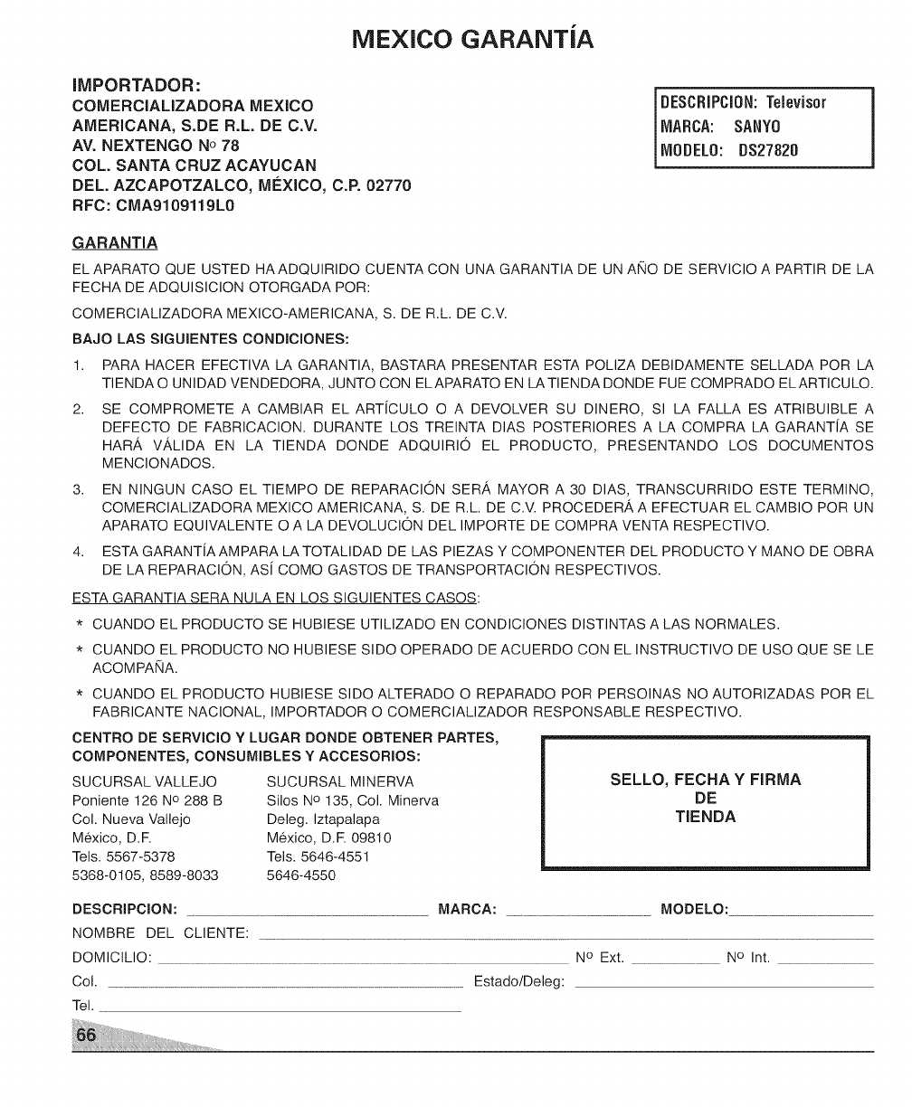 ESTA GARANTiA LIMITADA ES VALIDA UNICAMENTE EN TELEVISORES SANYO COMPRADOS Y USADOS