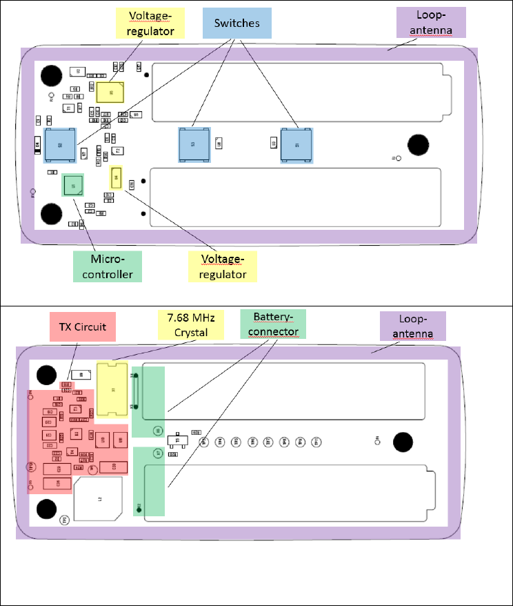 Besides the host and the radio system the module also includes a power management circuit, battery connector, 3 switches, and small discrete components.