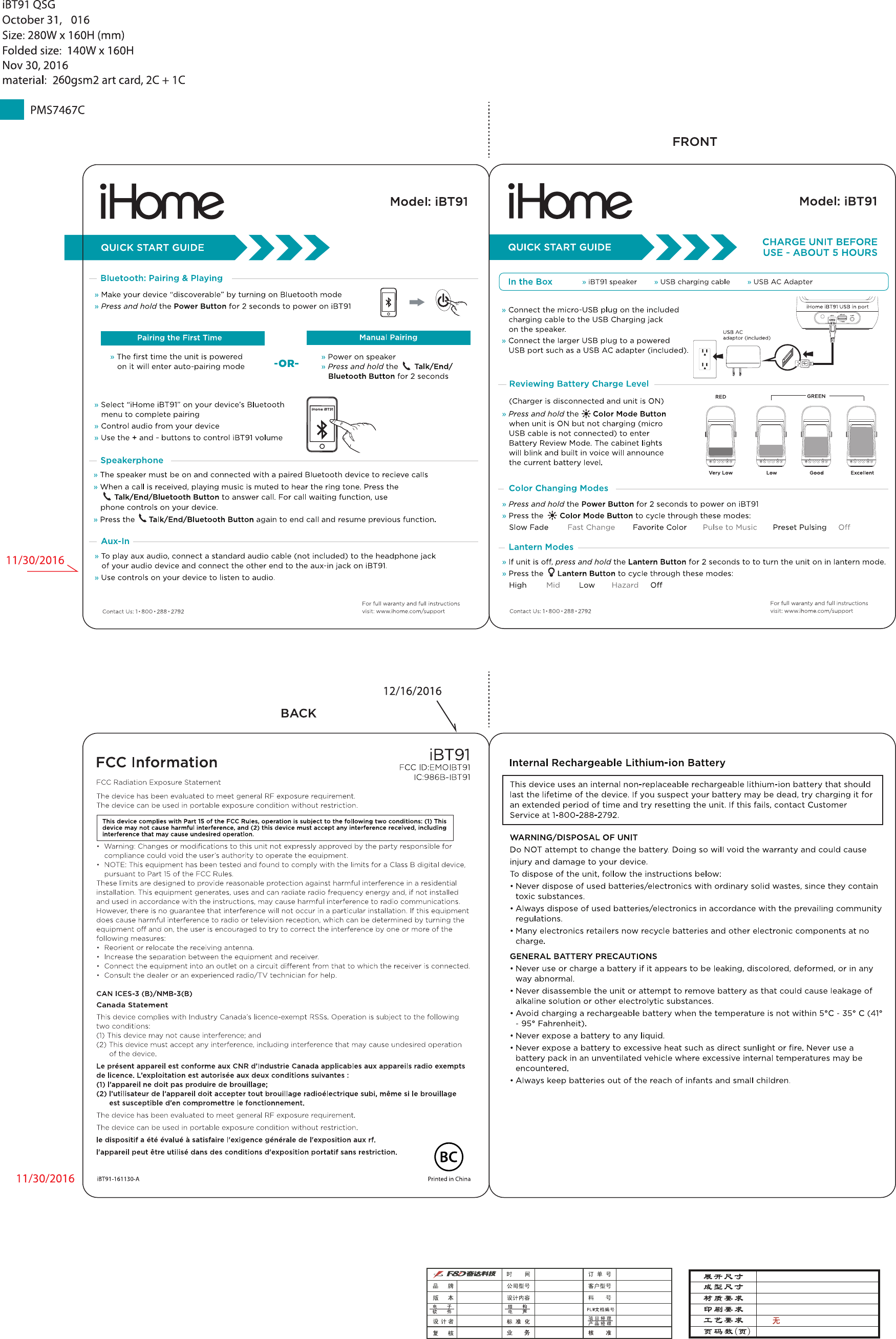 SDI Technologies Inc. Splashproof Rechargeable Bluetooth Lantern Speaker iBT91 QSG v8 1216 O