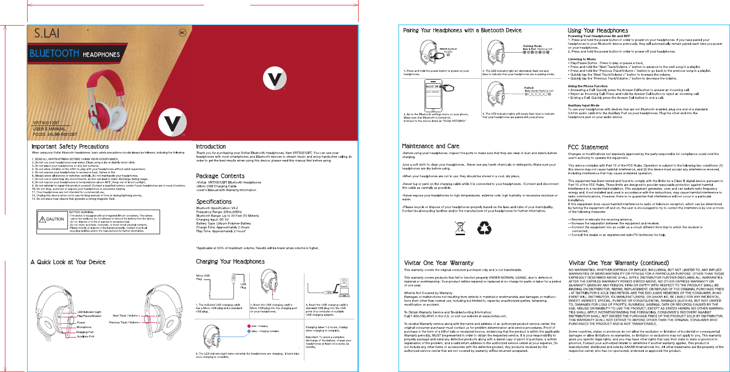 SHENGLAI TECHNOLOGY 50012BT Bluetooth Headphone User Manual VRT50012BT