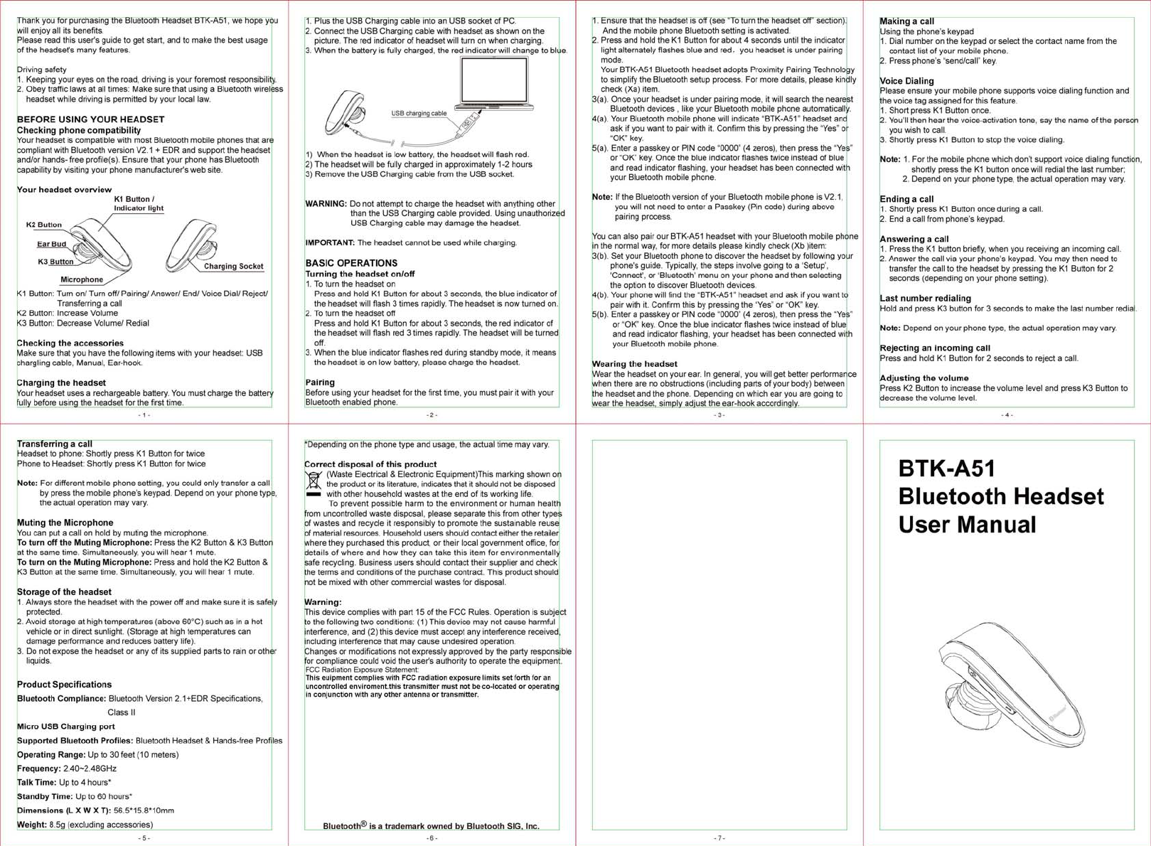 SHI KISB Electronic BTKA51 Bluetooth Headset User Manual print job