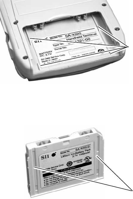 - Never touch the terminals on the Handheld Terminals or battery packs with