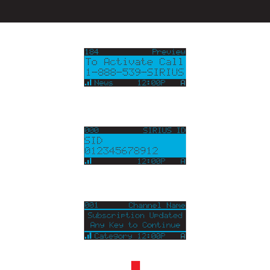 5. When the Factory Default is complete, the Receiver will tune to Channel 184 the SIRIUS preview channel