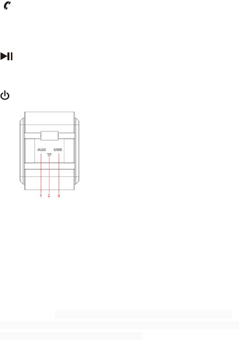 3、-:Short press for previous song in TF/SD card via Bluetooth, long press to