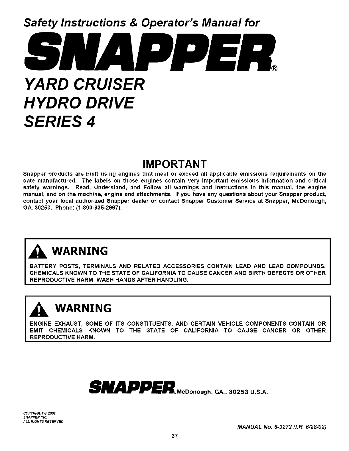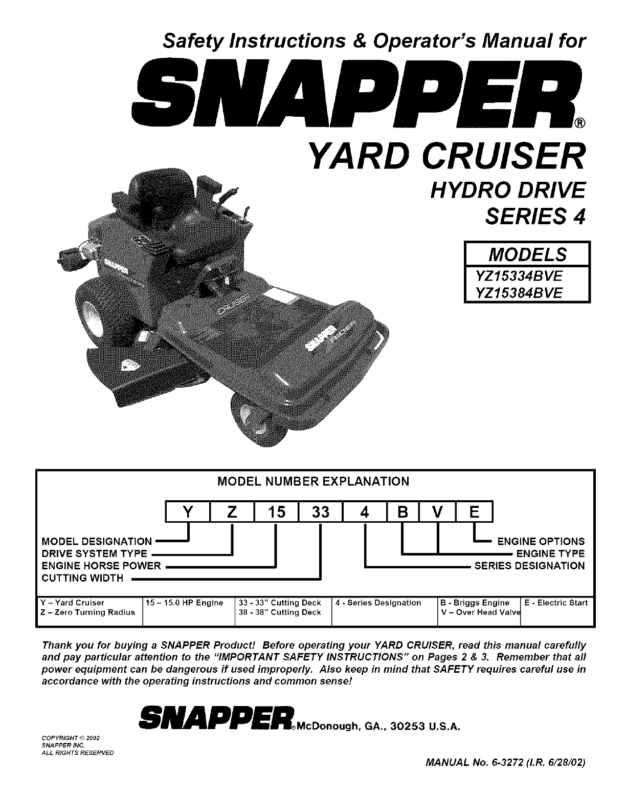 Thank you for buying aSNAPPER Product! Before operating your YARD CRUISER, read this manual carefully