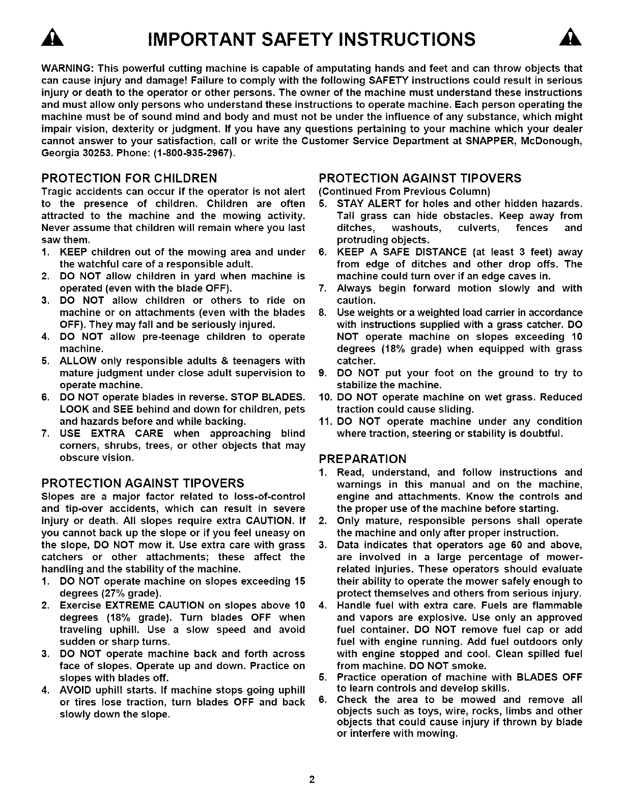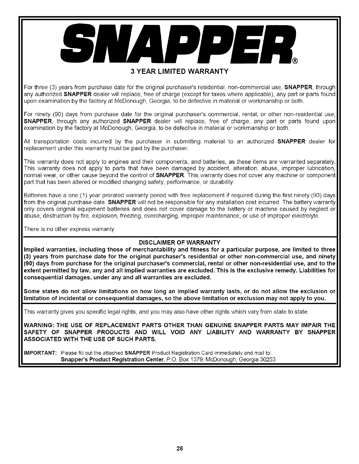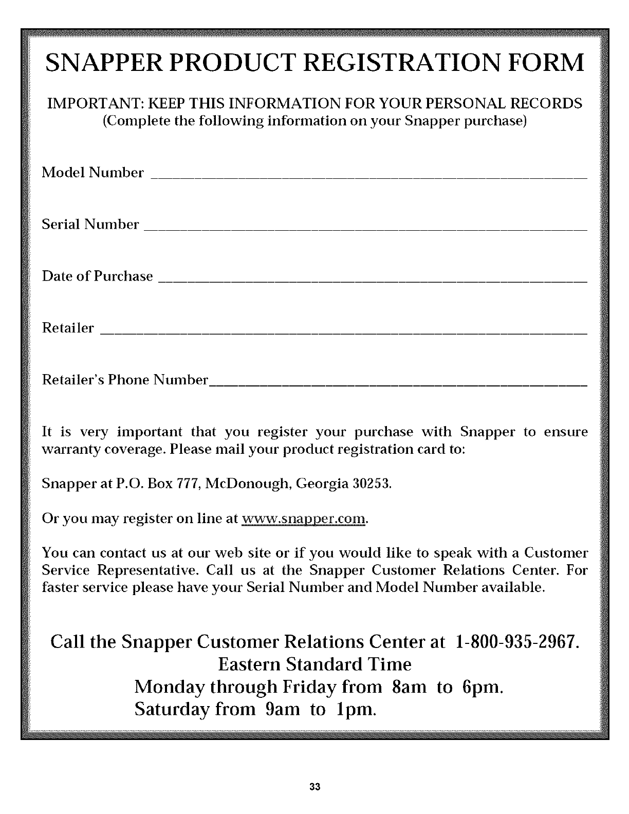 cannot answer to your satisfaction, call or write the Customer Service Department at SNAPPER, McDonough,