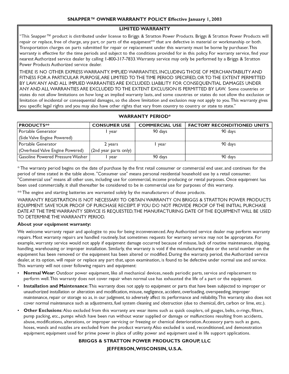 WARRANTY REGISTRATION IS NOT NECESSARYTO OBTAIN WARRANTY ON BRIGGS & STRATTON POWER PRODUCTS