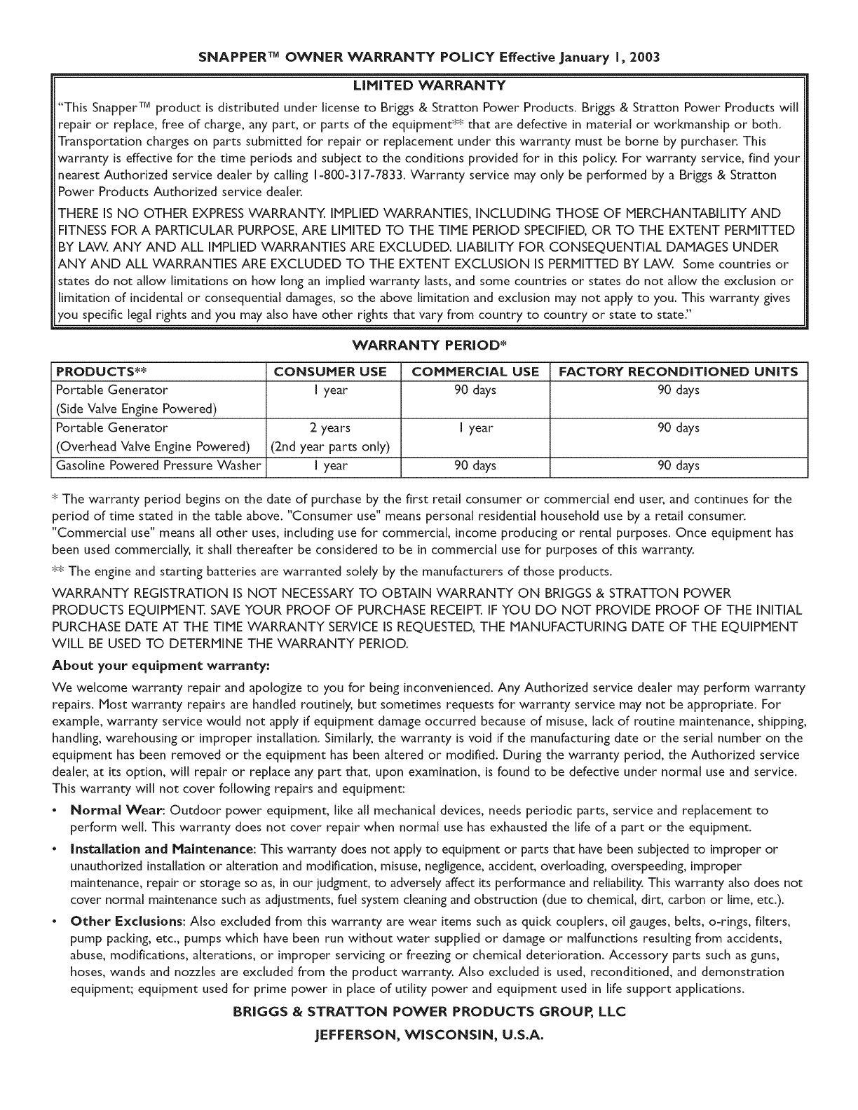 SNAPPER TM OWNER WARRANTY POLICY Effective January I, 2003
