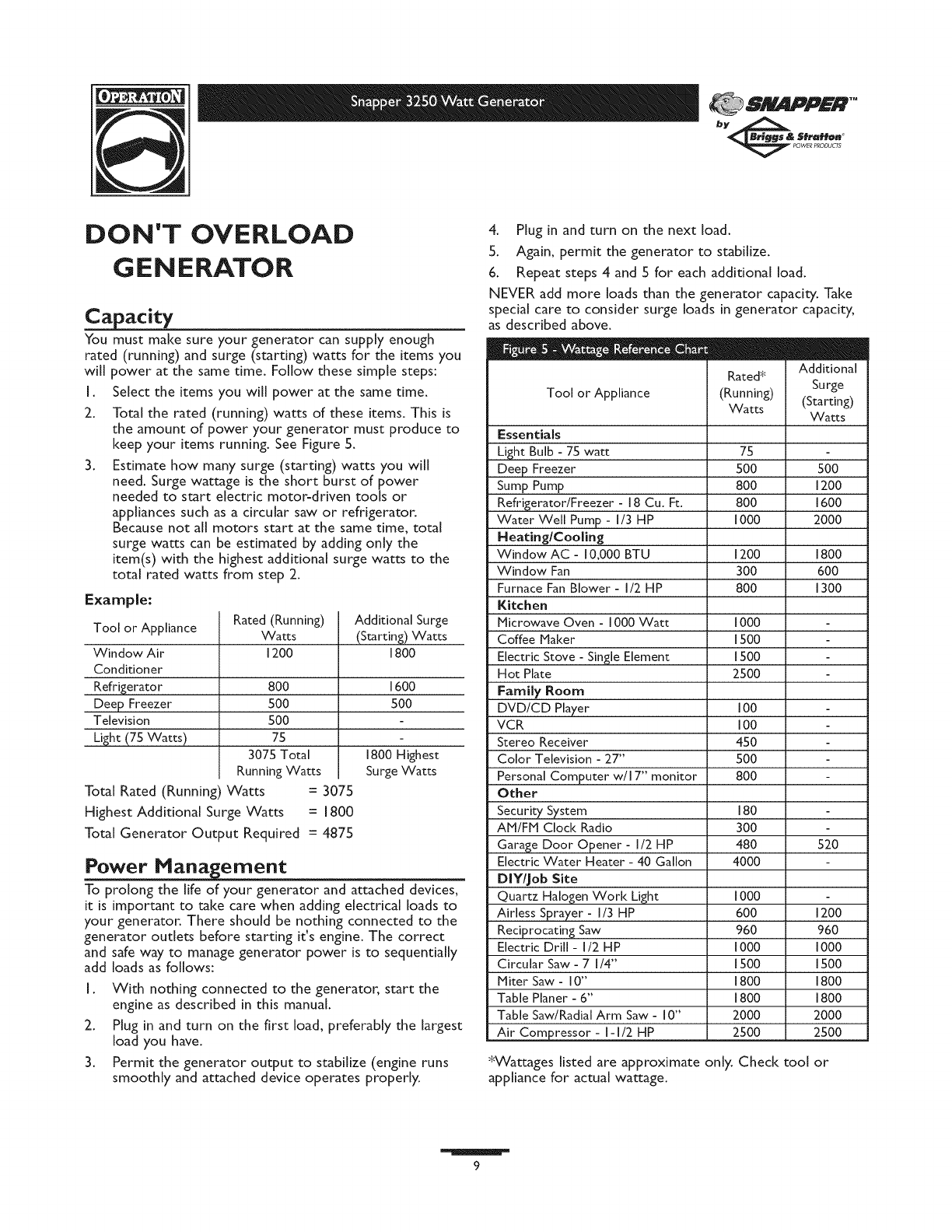 CAUTION! DO NOT exceed the generator's