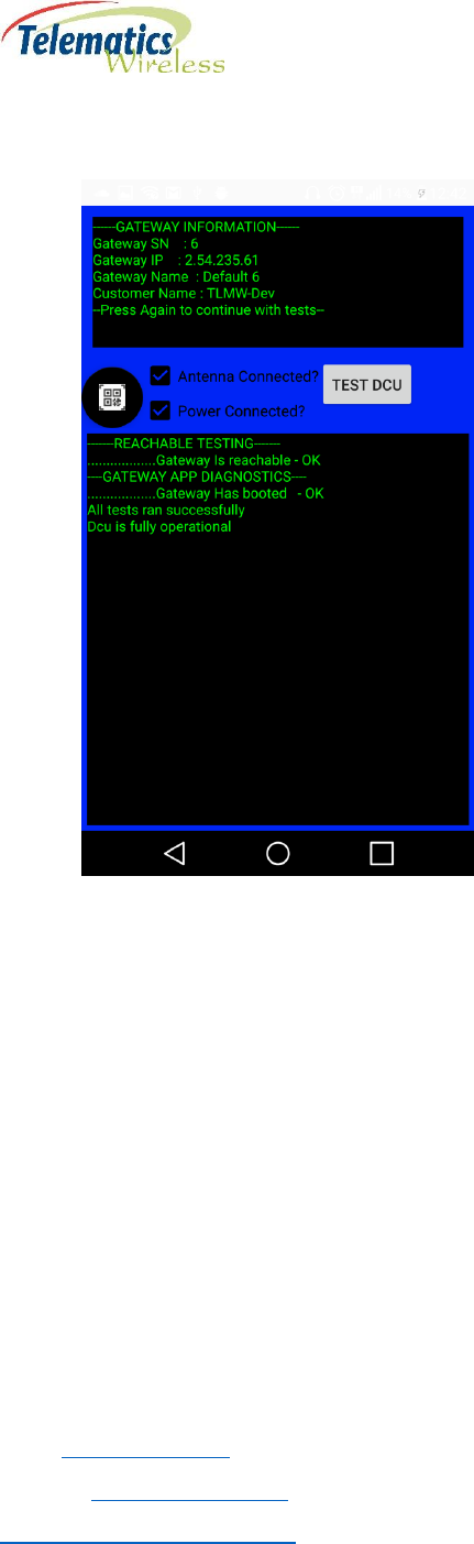 Note: If the DCU tests did not run successfully, contact Telematics support for assistance in