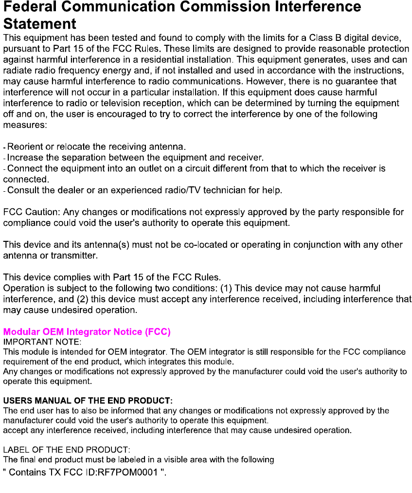 Contains FCC ID: RF7POM0001 The enclosed device complies with Part 15 of the FCC Rules.