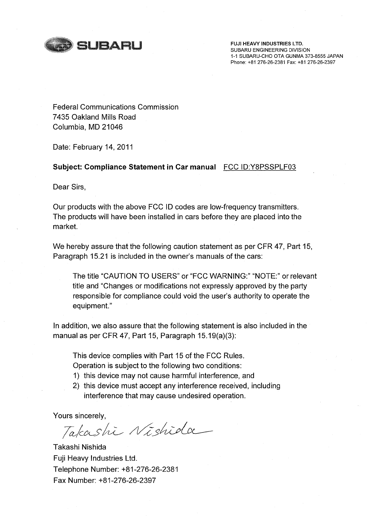 Fuji Heavy Industries Ltd. Smart LF Oscillator Complinace Statement