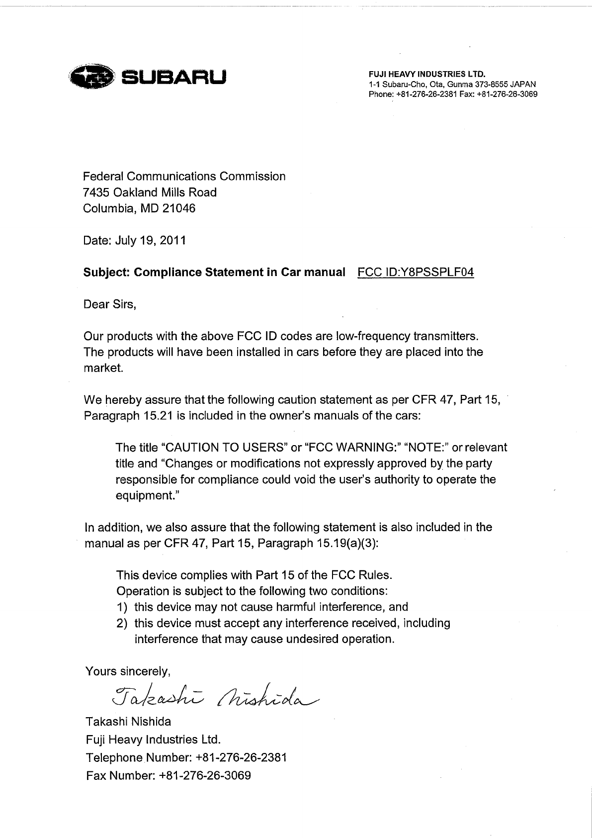 Fuji Heavy Industries Ltd. Smart LF Oscillator Compliance Statement