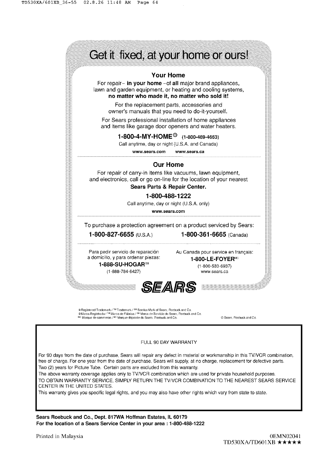 TO OBTAIN WARRANTY SERVICE, SIMPLY RETURN THE TV/VCR COMBINATION TO THE NEAREST SEARS SERVICE