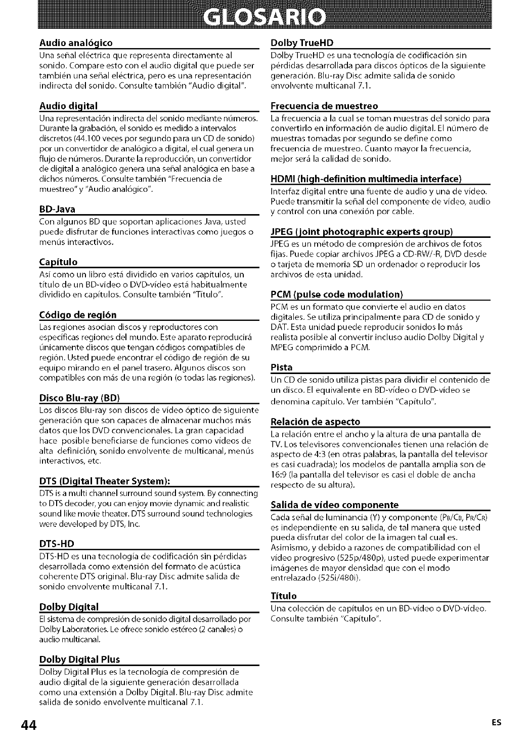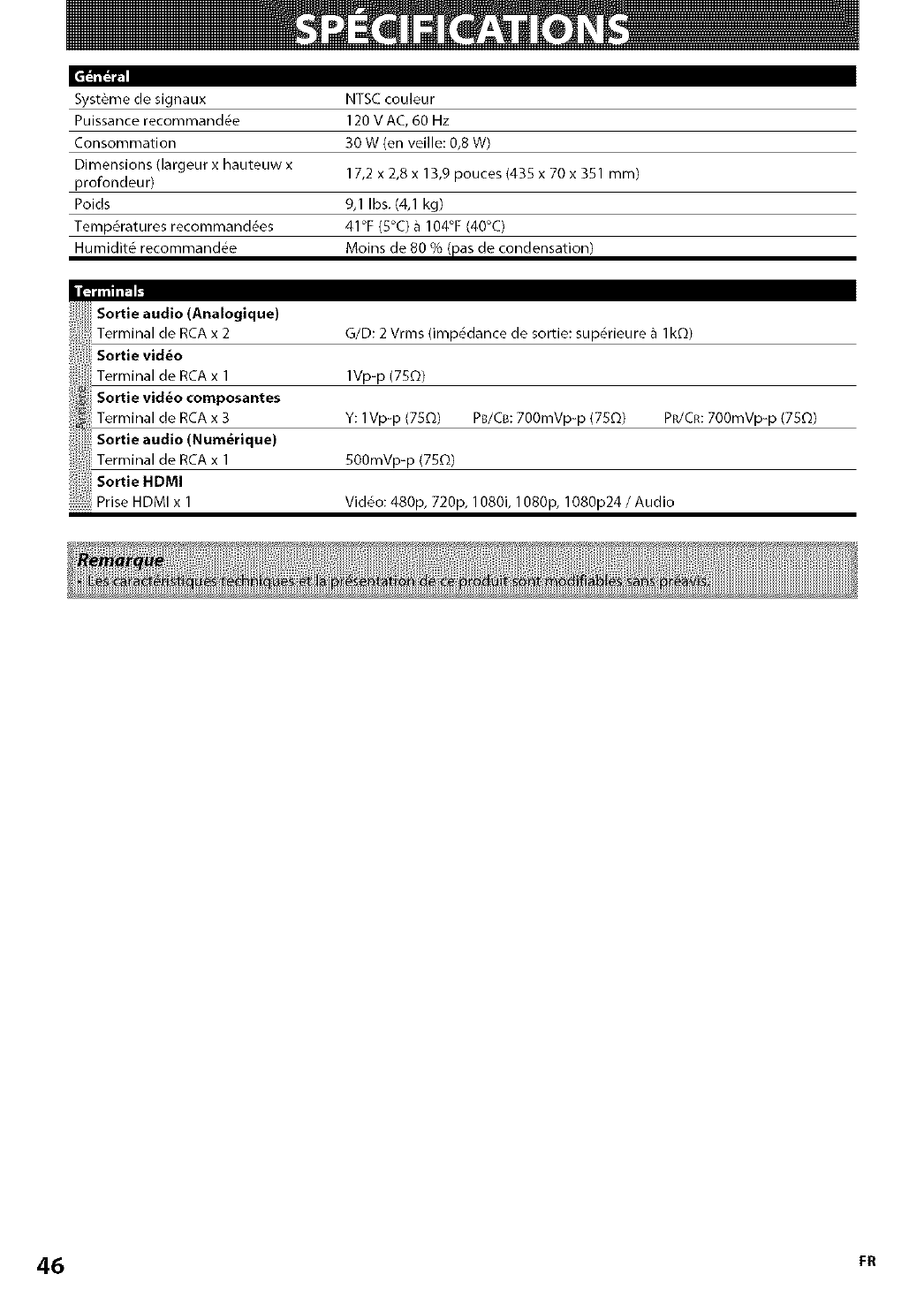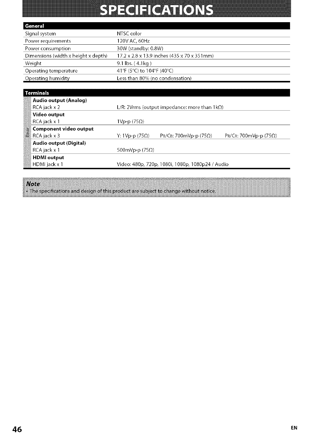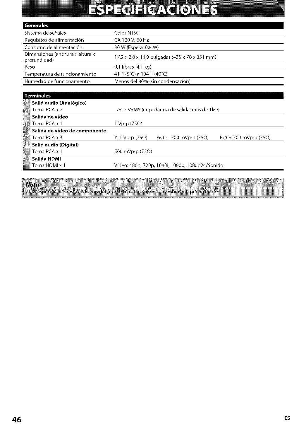 Terminal de RCA x 3 Y: 1Vp-p (75_) PB/CB: 700mVp-p (75_) PR/CR: 700mVp-p (75_)