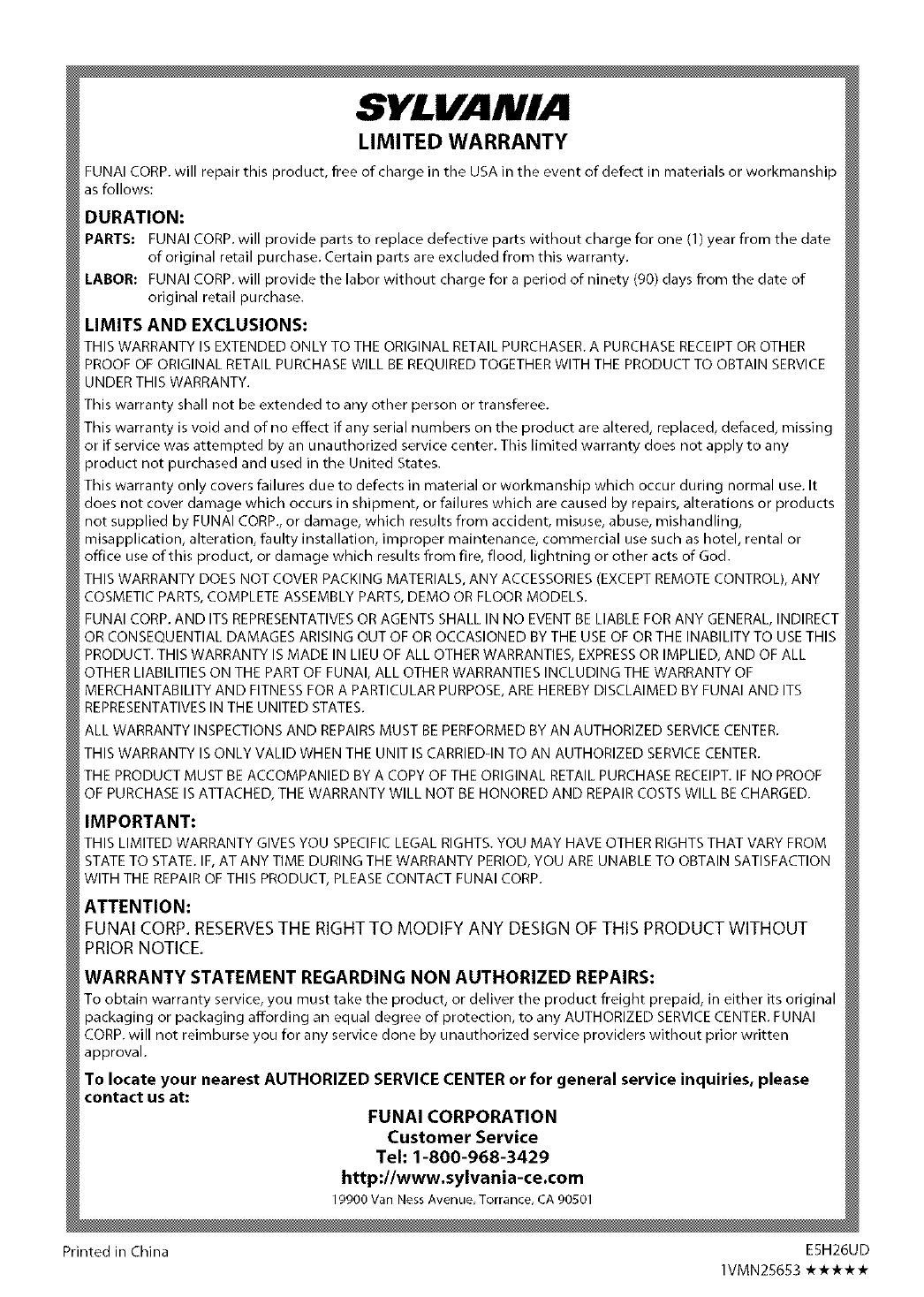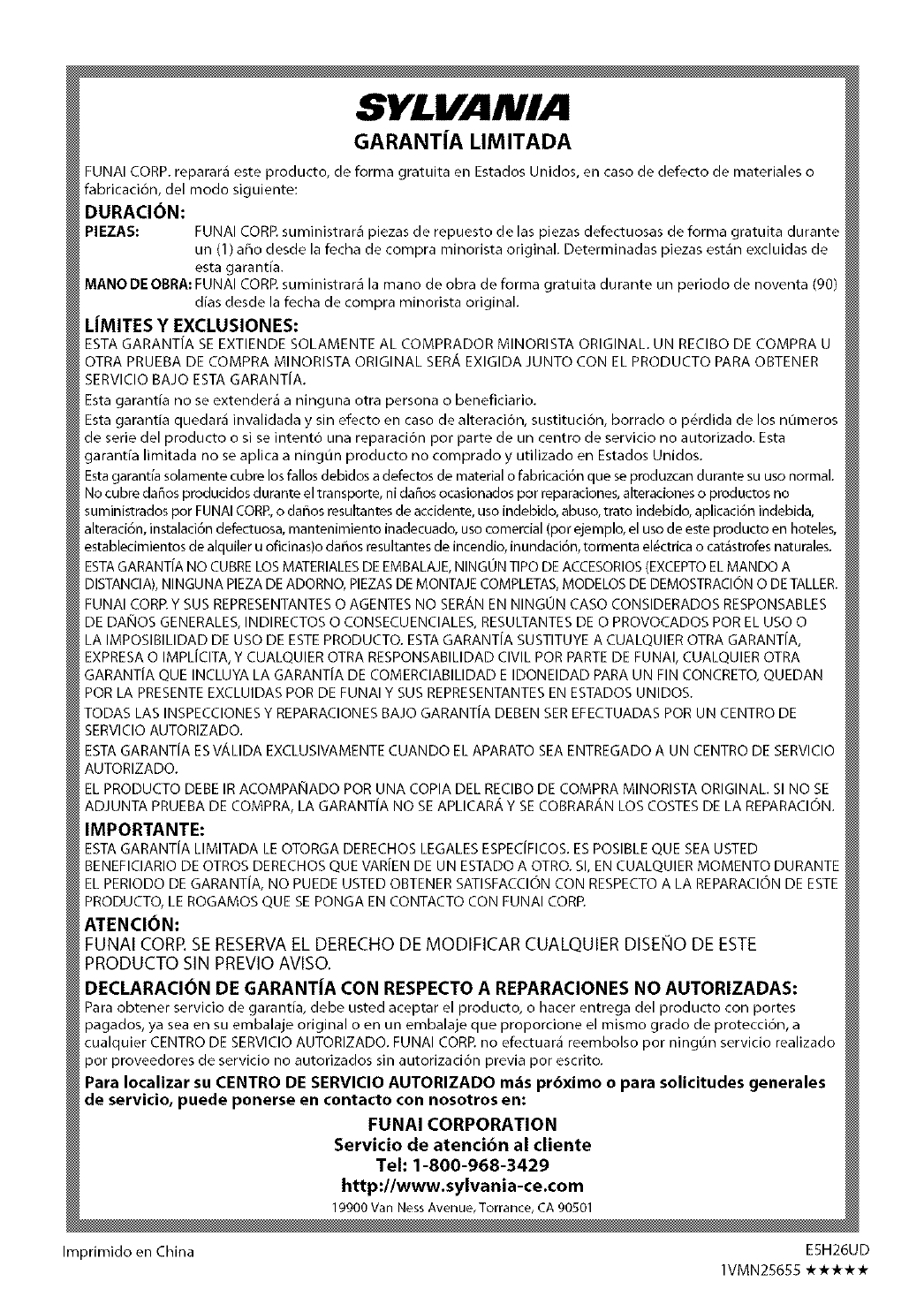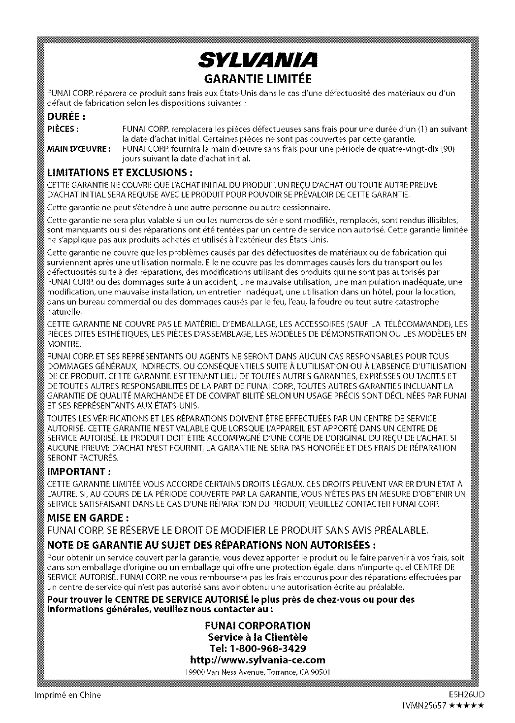 PIECES : FUNAI CORP. remplacera les pi_ces d_fectueuses sans frais pour une dur_e d'un (I) an suivant